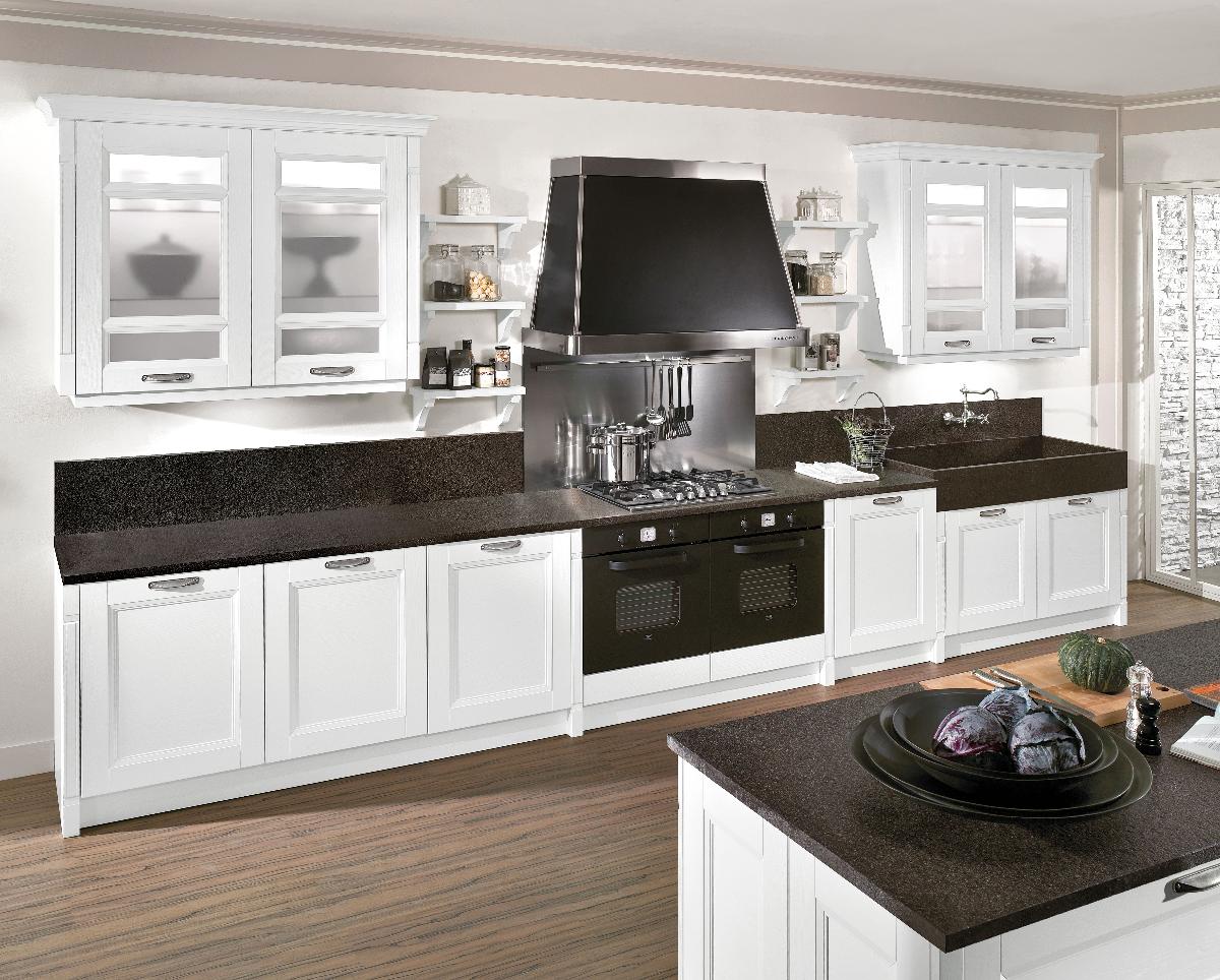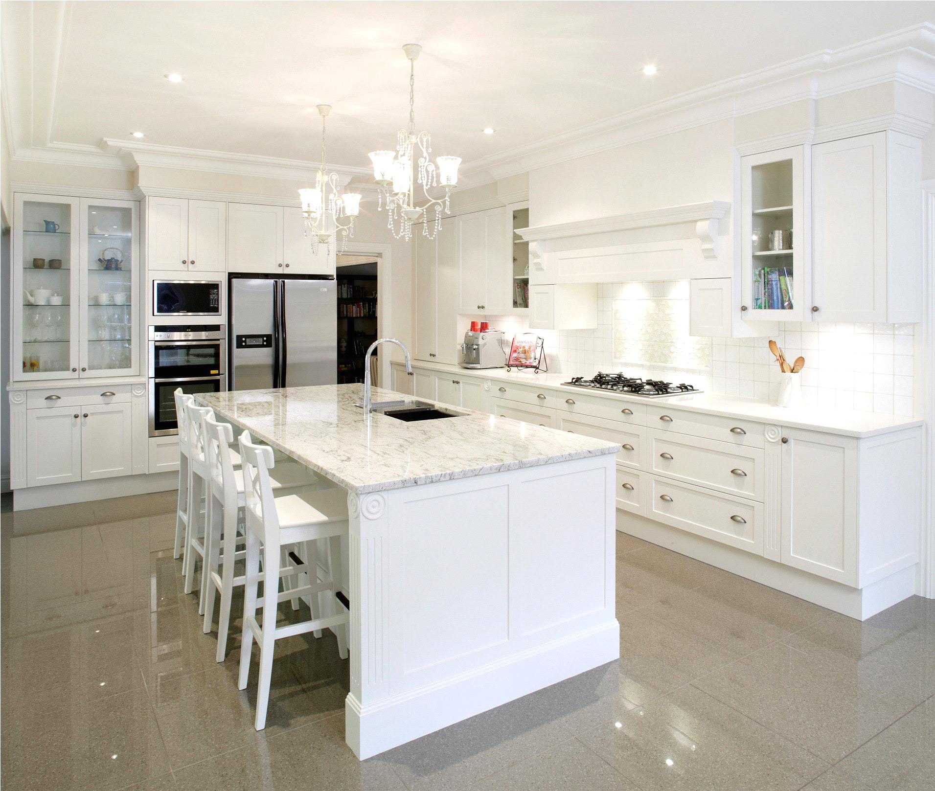 L'utilisation de tons blancs semble impeccable dans un style classique. Malgré la sagesse conventionnelle sur la «salle d'opération à la maison», la cuisine blanche à l'intérieur n'a pas toujours l'air unique.Le look le plus populaire est les surfaces mates, le tablier est fait de carreaux brillants.