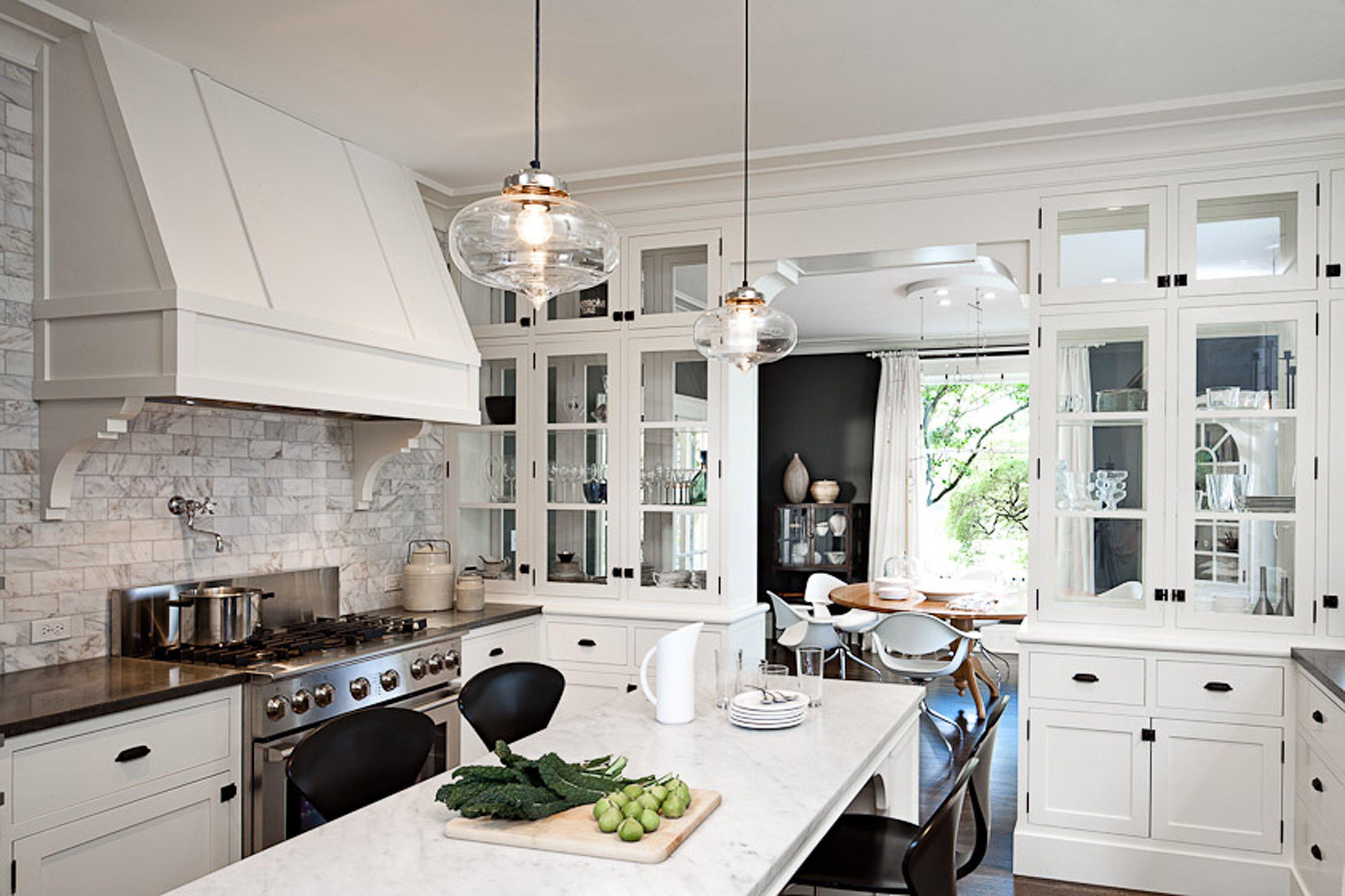 Dans les grandes maisons et appartements modernes, l'aménagement combine souvent un coin cuisine et une salle à manger. La pièce spacieuse d'une cuisine blanche nécessite un bon éclairage: la lumière zonale doit être divisée. Les plafonniers brillants sont très utiles au-dessus de la zone de travail, la salle à manger peut être éclairée avec de grandes lampes.