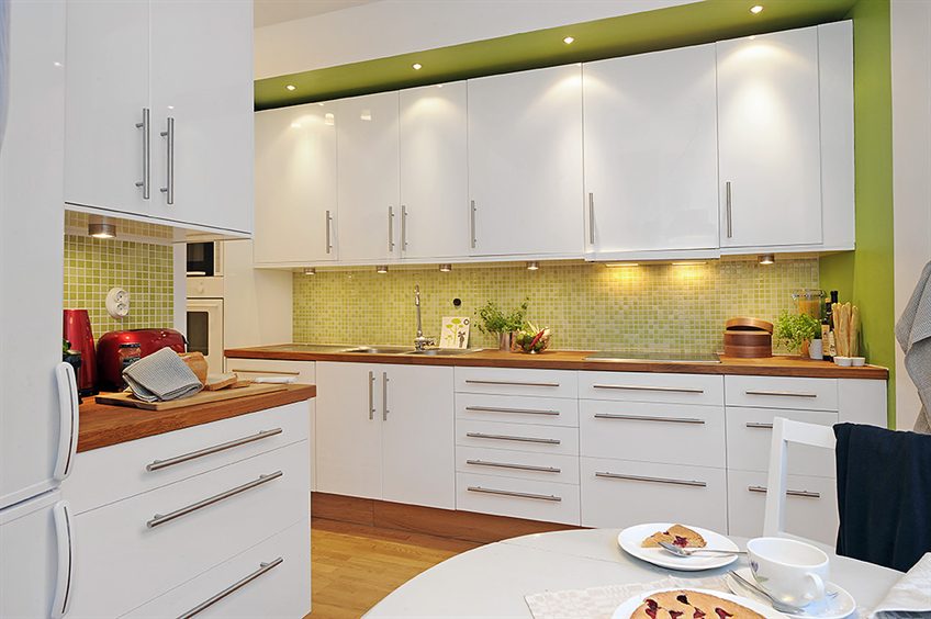 La combinaison populaire de "blanc + brun" est souvent utilisée dans la conception des pièces. Dans la cuisine blanche, les meubles bruns sont stricts et beaux. Une option intéressante est une paire de «blanc + vert». Cette combinaison améliore l'humeur, a l'air fraîche et est agréable à regarder.