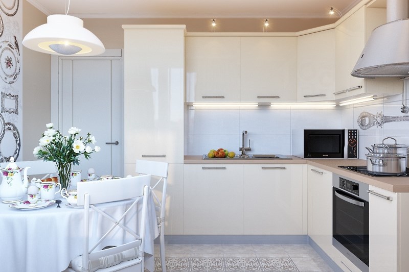 La conception sera décorée de moulures en stuc, de poutres spéciales et de plafonds à lattes. Le mot de conception final est les plafonds suspendus. Une cuisine blanc brillant avec des ampoules intégrées économise littéralement de minuscules compteurs de cuisine, vous empêchant de vous sentir mal à l'aise de l'espace exigu.