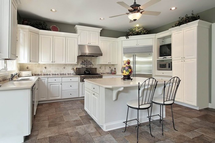 Les carreaux de céramique conviennent au sol de la cuisine blanche, les carreaux de porcelaine peuvent être posés, mais cela nécessitera des coûts importants. Le stratifié, le linoléum sont considérés comme des revêtements de sol plus accessibles, moins souvent - un sol en vrac. Le revêtement en bois si caractéristique du style classique dans le design moderne de la cuisine blanche semble quelque peu dépassé, en particulier dans le contexte de meubles coûteux, d'accessoires incrustés et d'une décoration élégante. Il est préférable de choisir une image «comme une pierre», «bois coupé» ou des tuiles noires qui ont l'air bien.