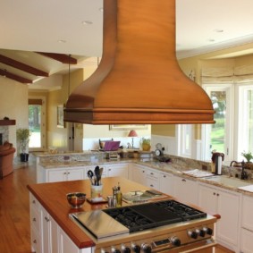 Une hotte de foyer îlot est pertinente si le poêle est au centre de la cuisine et ne jouxte aucun des murs. Parfois utilisé comme source de lumière principale. Regarde harmonieusement dans la cuisine dans un style moderne ou un style hi-tech.