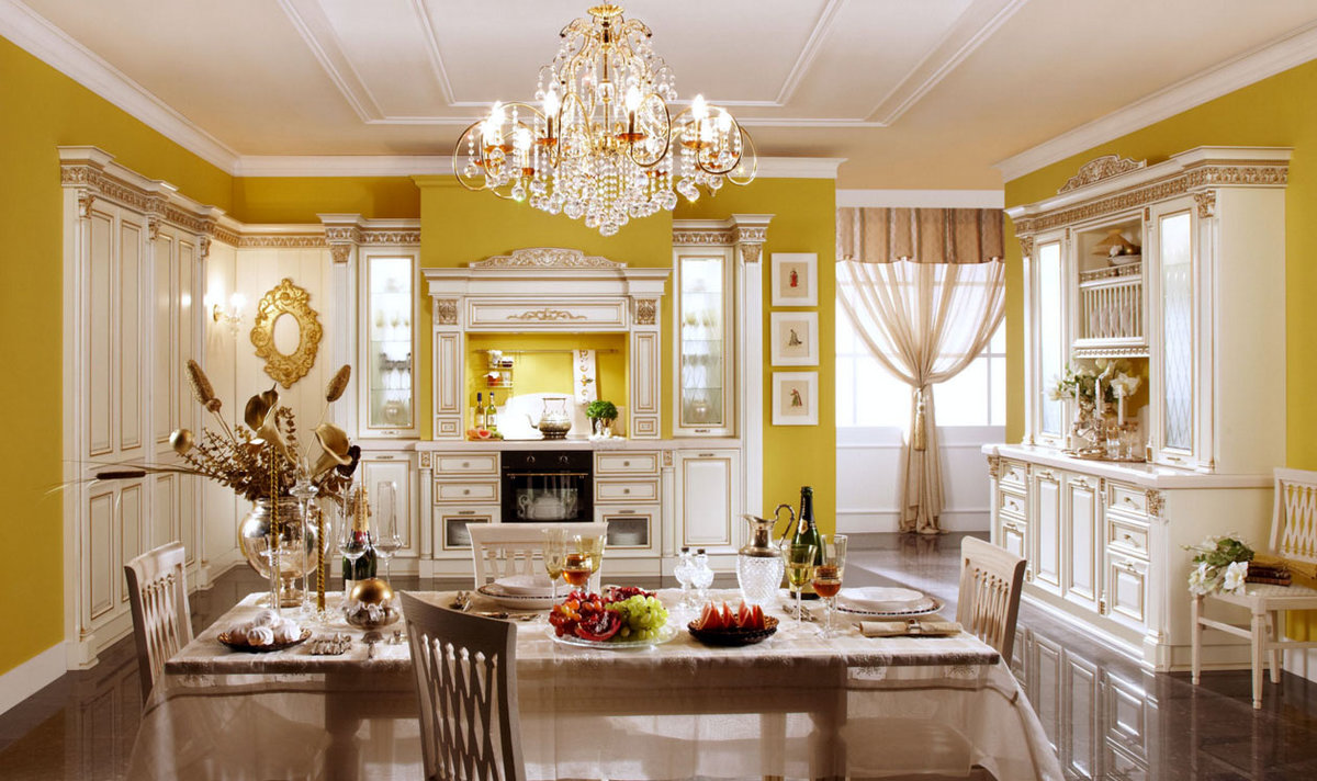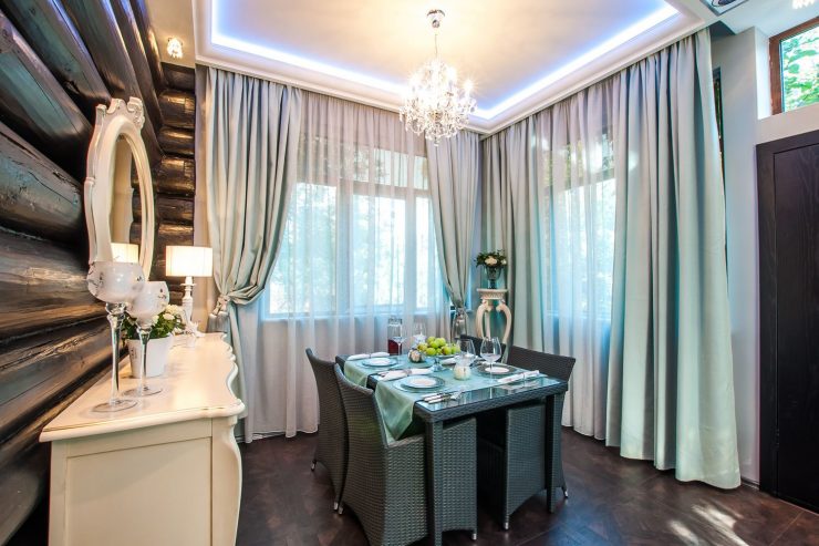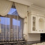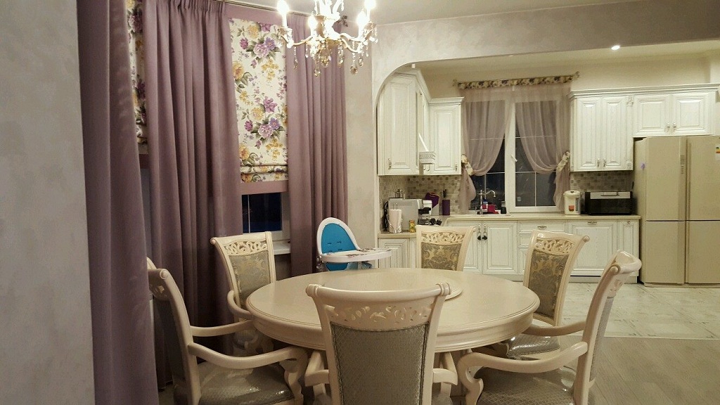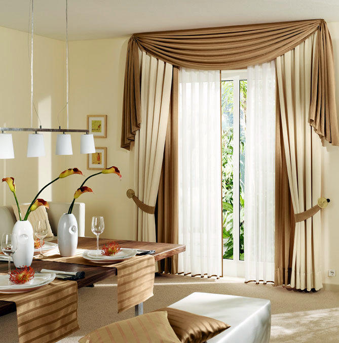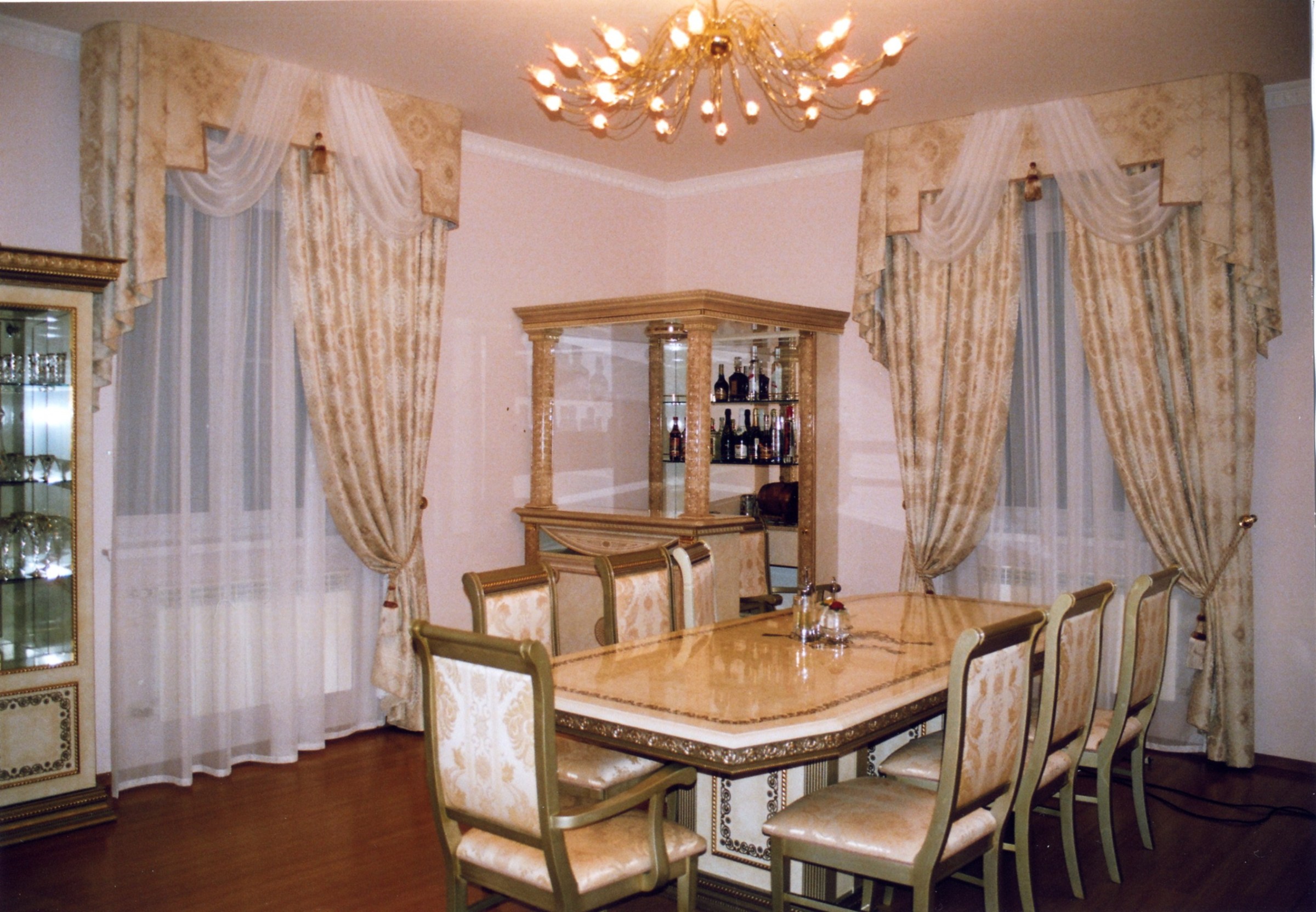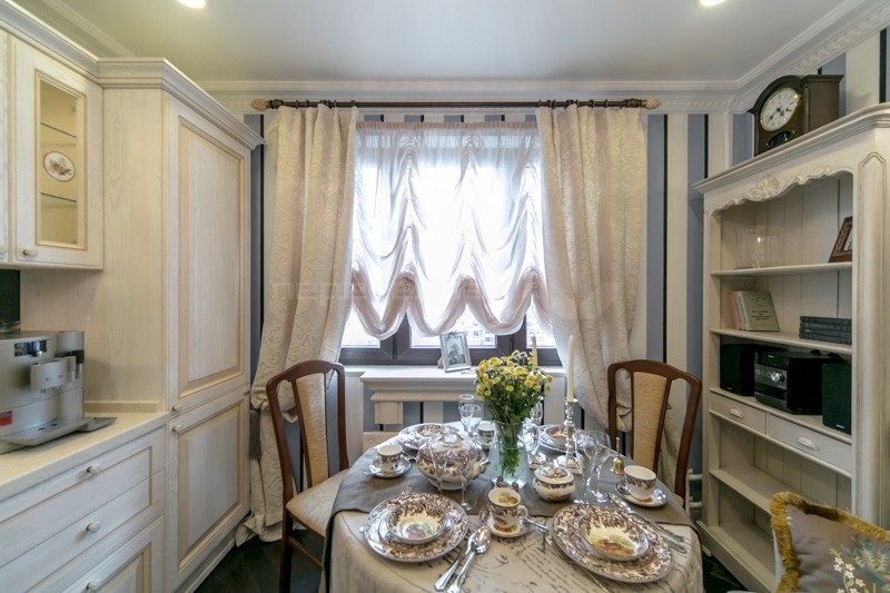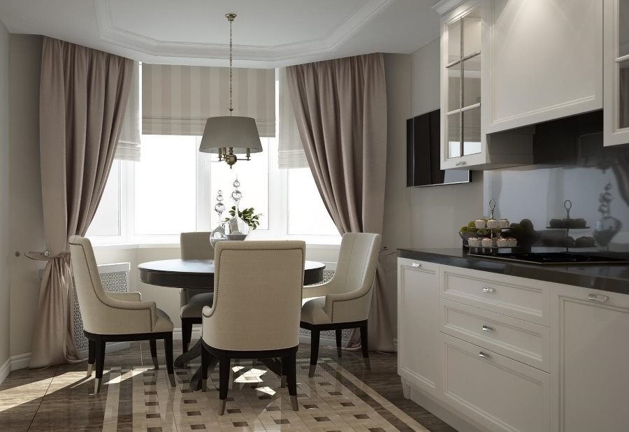 Pour le style classique, le tulle, les lambrequins et les toiles latérales peuvent être une excellente solution. Près de la salle à manger, vous pouvez utiliser les longs rideaux de sol et le tulle.