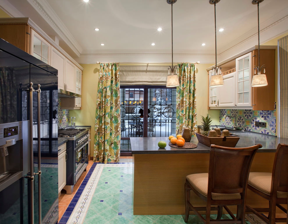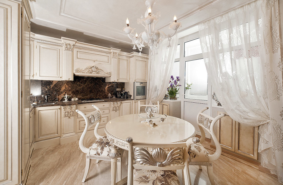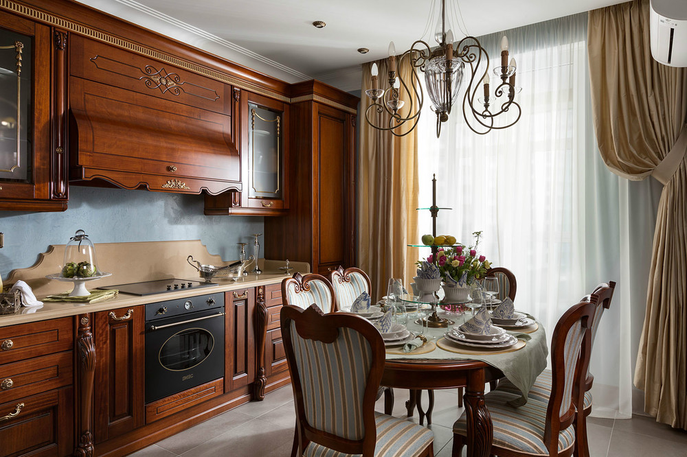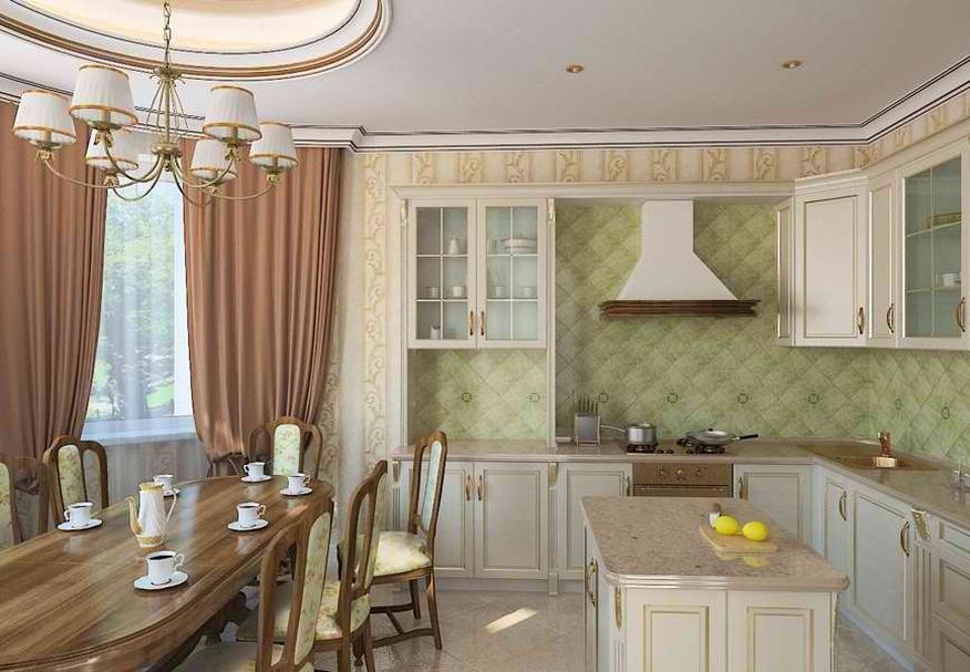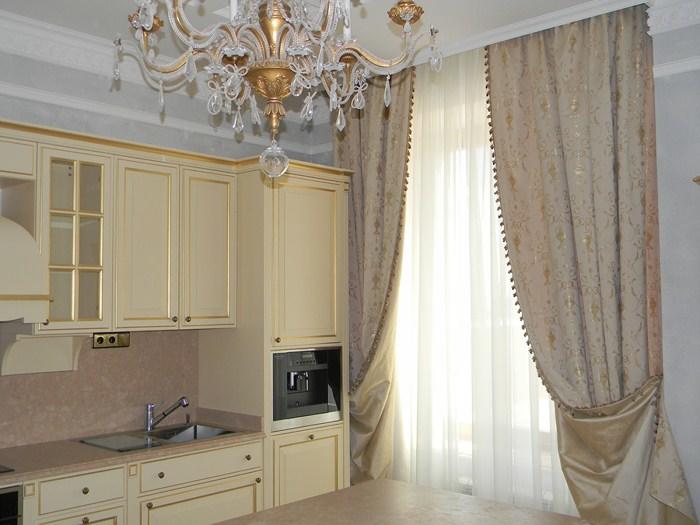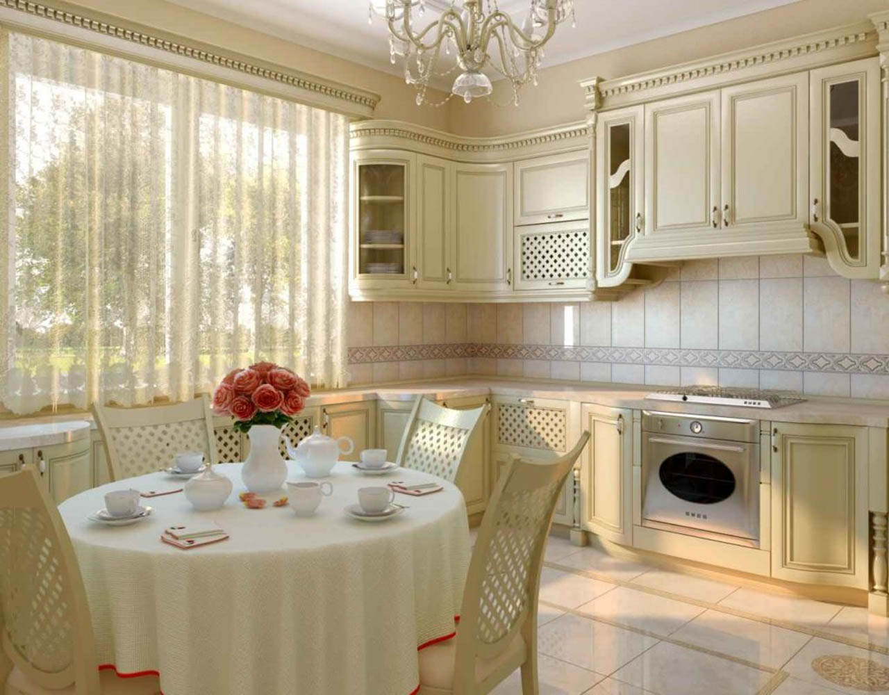 L'ensemble habituel de portières à la cuisine classique peut inclure un rideau en matériau assez transparent. Souvent, les designers combinent des matériaux transparents légers et assez lourds. Diverses variations de couleurs sont également utilisées qui résonnent avec les tons de base de l'intérieur. Une telle conception sera solide.