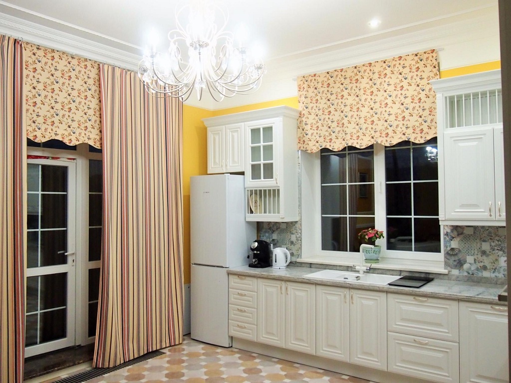 Les rideaux classiques finis pour la cuisine avec une porte de balcon peuvent être difficiles à trouver en raison des tailles non standard. En conséquence, avant de vous rendre à l'atelier, il est préférable d'étudier attentivement toutes les options pour la conception de la cuisine 2019, ainsi que les options pour les rideaux dans un style classique.
