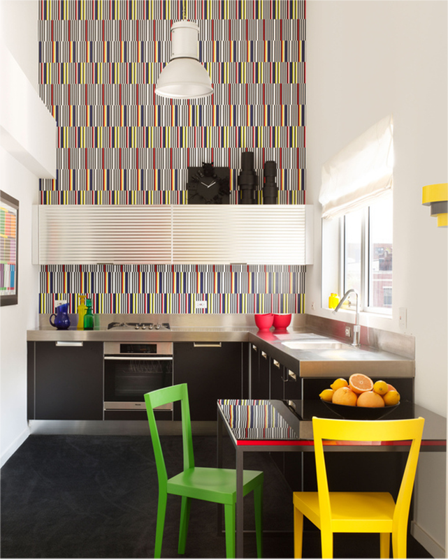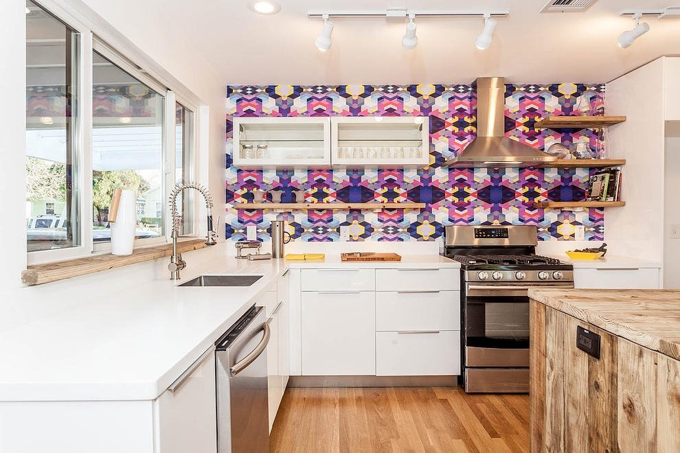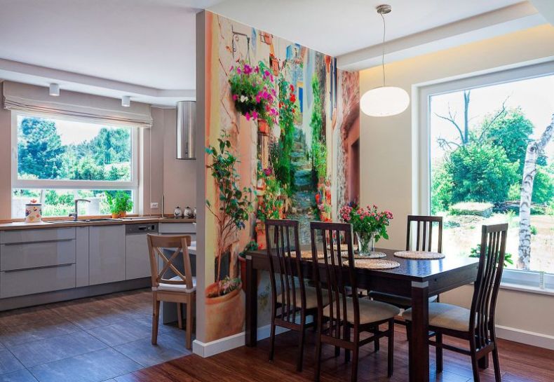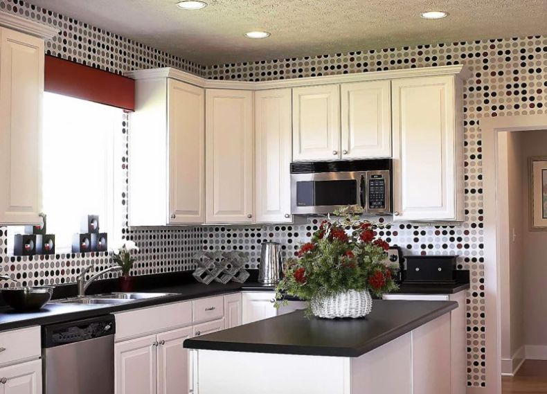 Le papier peint lumineux sur la cuisine est idéal pour les pièces avec une petite surface et des plafonds bas.