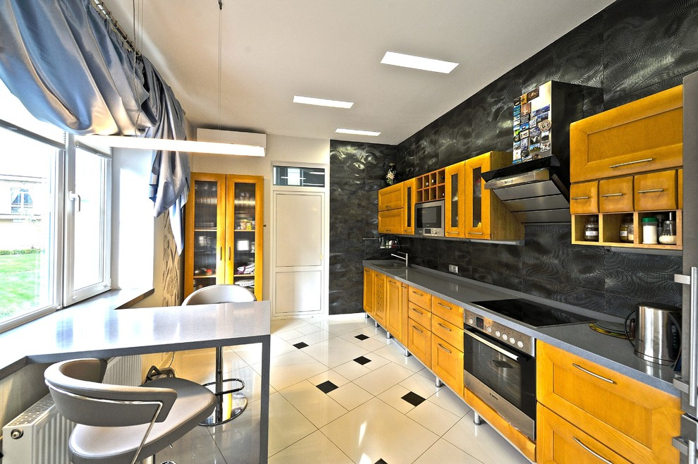 - On pense que le papier peint sombre à l'intérieur d'une petite cuisine est inapproprié, mais des peintures noires sur le mur d'accent, complétées par des zones claires, créeront une sensation d'espace plus profond.