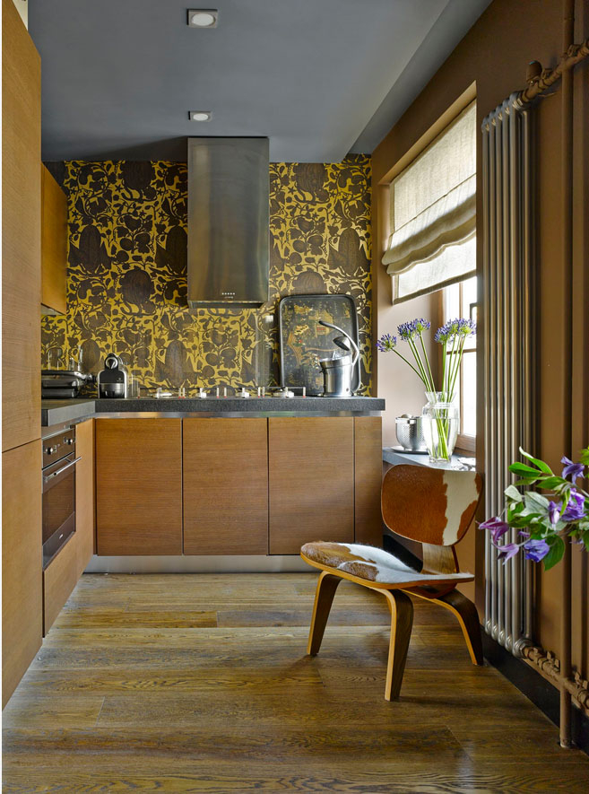 Le papier peint foncé dans la cuisine conviendra aux pièces spacieuses et lumineuses avec de hauts plafonds.