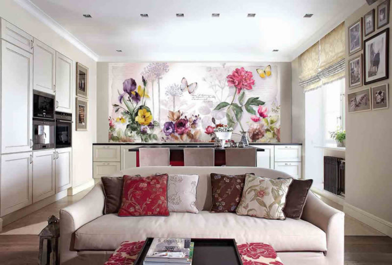 Les couleurs unies se marient parfaitement avec le papier peint à fleurs. De plus, les grandes fleurs auront une allure élégante dans une pièce spacieuse, et les petites conviennent mieux à une petite cuisine.