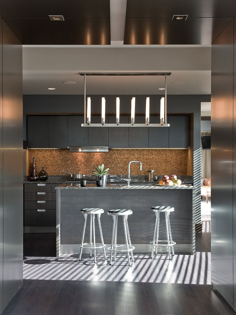 Pour une telle cuisine, les éléments en liège, les peintures murales en verre de couleur claire et les peintures murales non tissées en noir et blanc avec les motifs des grandes villes sont parfaits.
