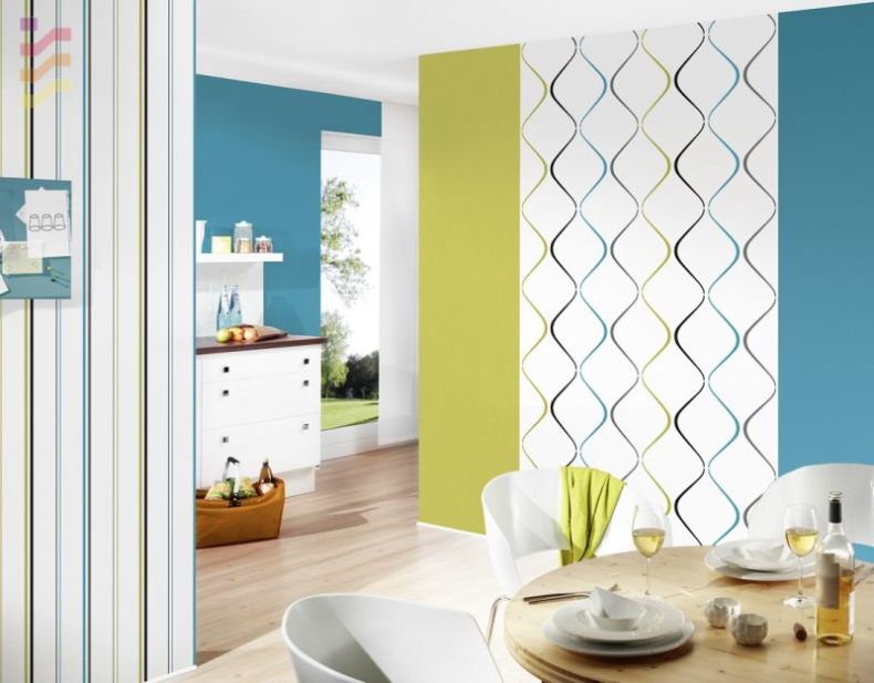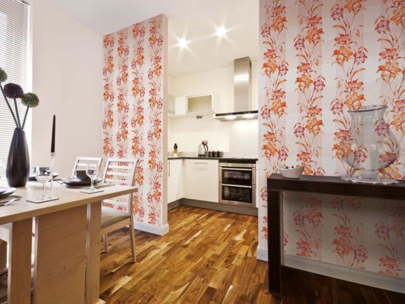 Pour la cuisine, les papiers peints de couleur crème, brun-beige et vert bleuâtre sont le plus souvent choisis. Les pièces mal éclairées sont peintes dans des tons jaune clair et rose clair, ce qui augmente la réflexion de la lumière, augmentant ainsi le degré d'éclairage de la pièce.