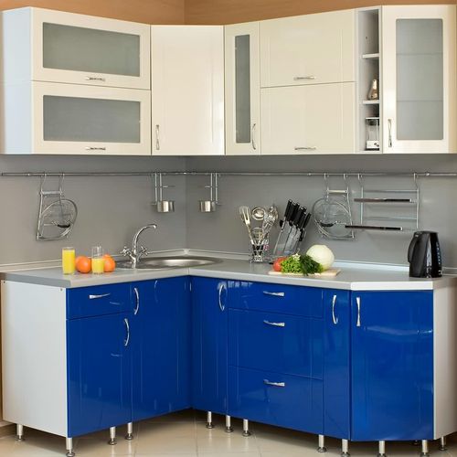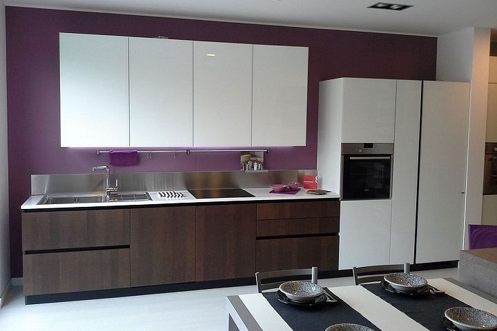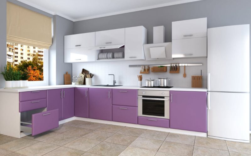 Une combinaison de couleurs blanches et violettes a l'air bien dans un intérieur moderne; vous pouvez ajouter une teinte bleue à un tablier de cuisine