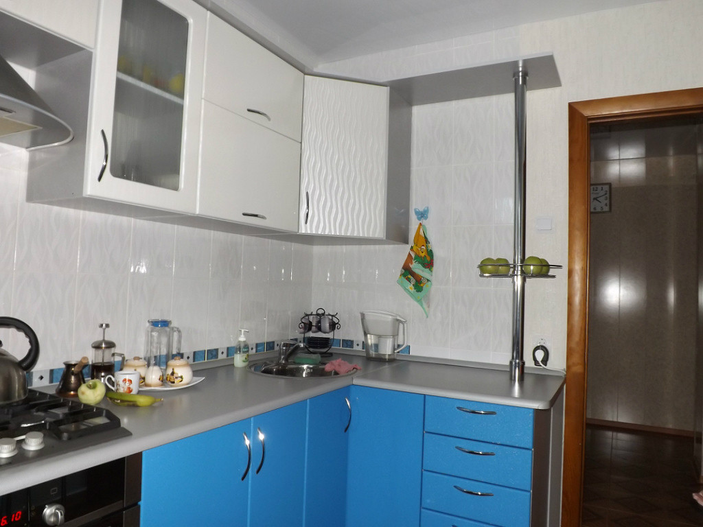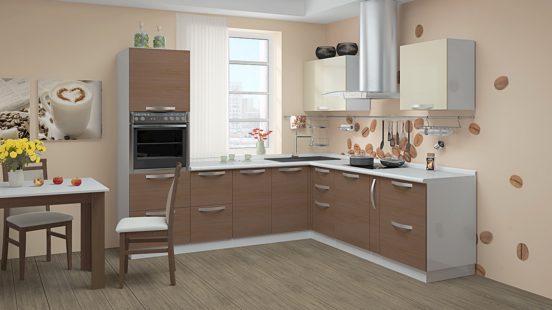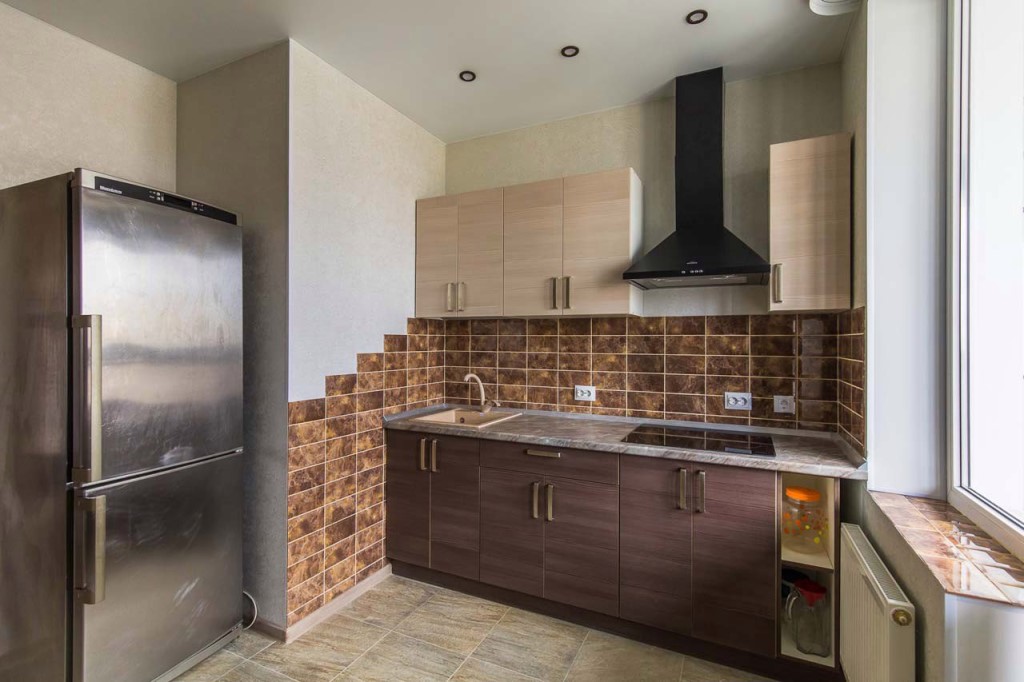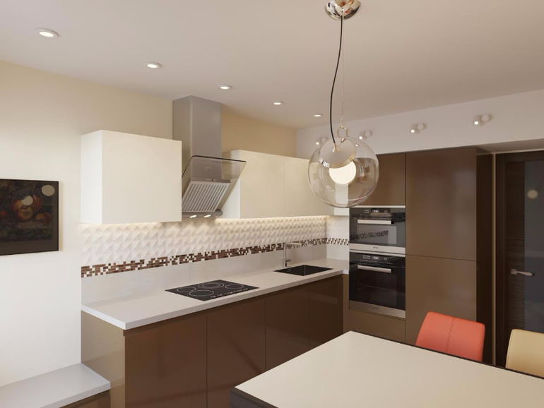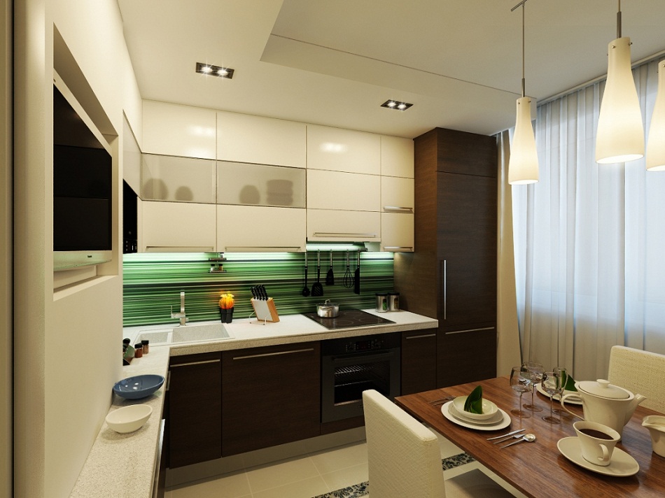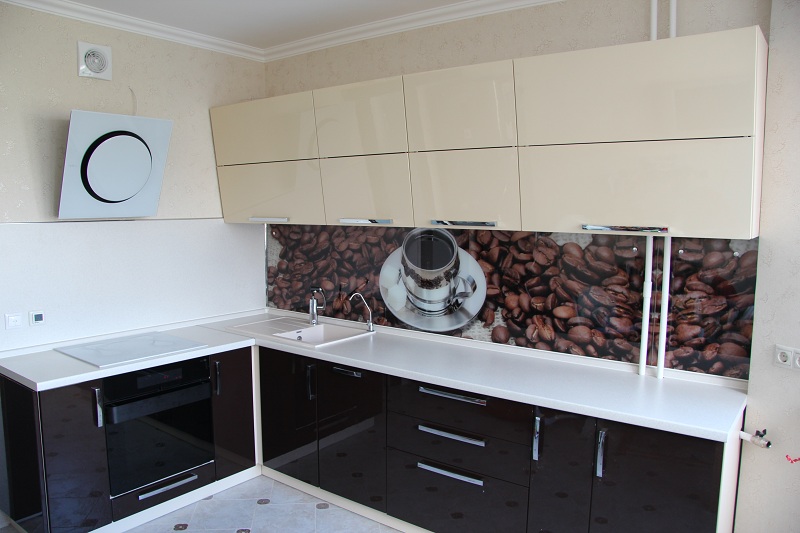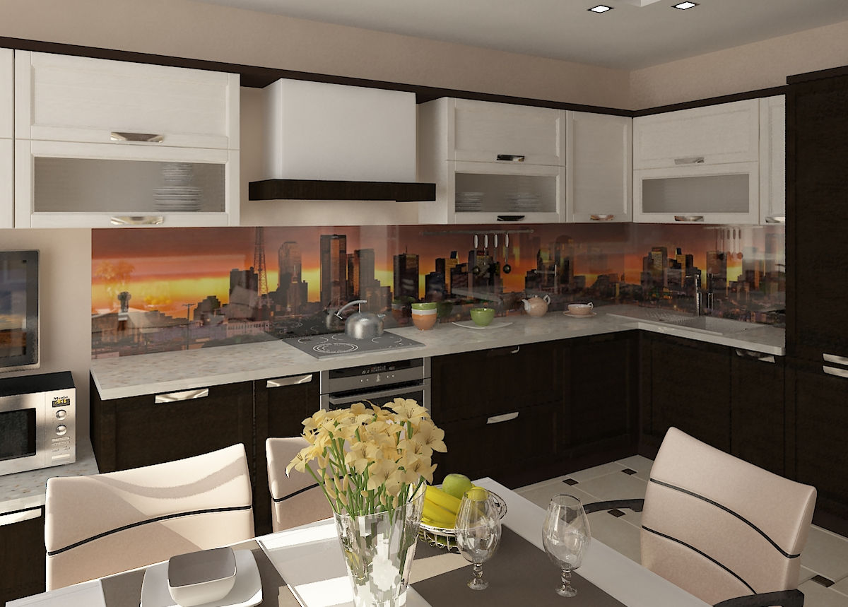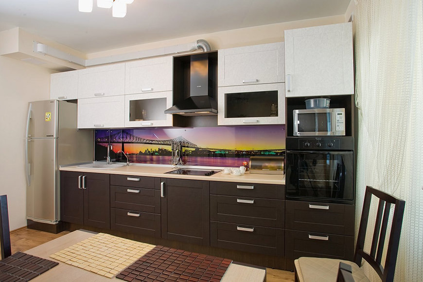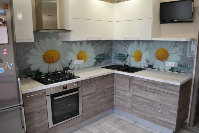 Un tablier deviendra cet élément qui diluera l'atmosphère ennuyeuse de deux couleurs. Les concepteurs déconseillent d'en faire trop et n'utilisent que trois teintes, afin de ne pas onduler dans les yeux. Mais le tablier peut avoir un motif, et c'est une bonne idée. L'essentiel est que les tons de l'image sur le tablier correspondent à l'intérieur général.