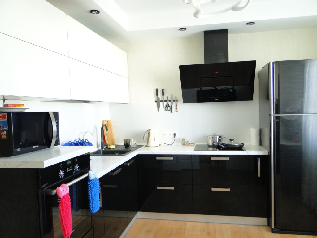 - Si vous choisissez le noir, presque toutes les nuances conviennent à la partie supérieure de la cuisine. Mais il y a des couleurs qui ne se combinent pas avec d'autres tons.