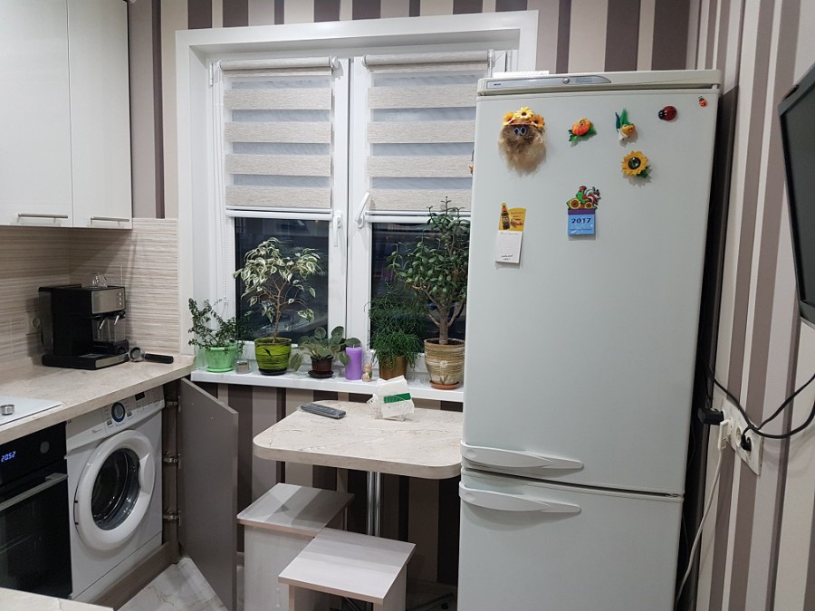 Avec la réparation de la cuisine de Khrouchtchev, vous pouvez également envisager la possibilité d'une nouvelle planification - démolir une partie du mur en changeant le salon et combiner ces deux pièces. Mais cette option ne convient que si le mur n'est pas porteur.