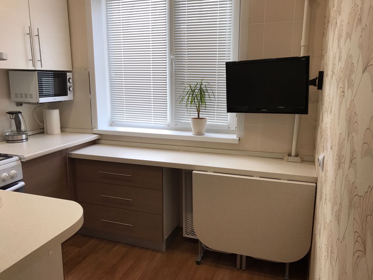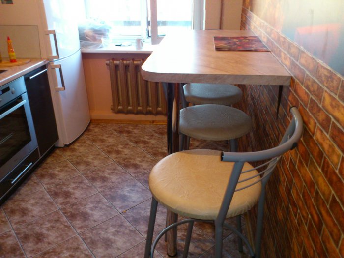 - La hauteur du comptoir est égale à la hauteur du rebord de la fenêtre. Sur le mur près de la fenêtre, le comptoir traverse tout le mur - cela permet de créer plus de surfaces à utiliser. La largeur d'un tel rebord doit être au maximum de 30 à 35 centimètres.