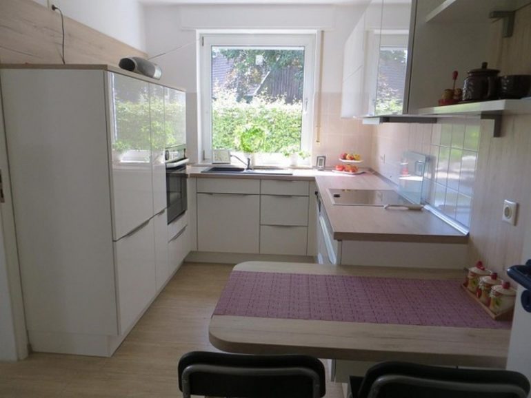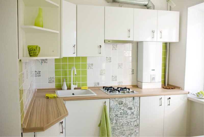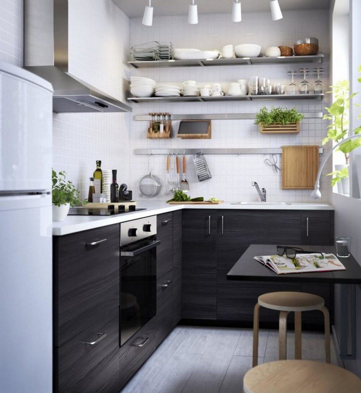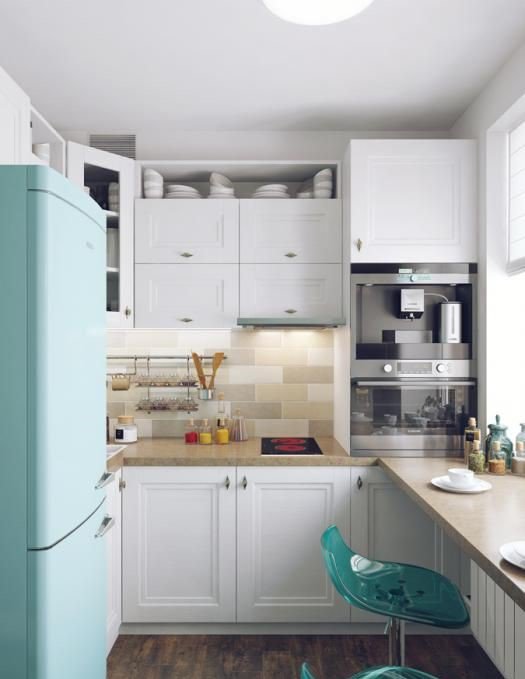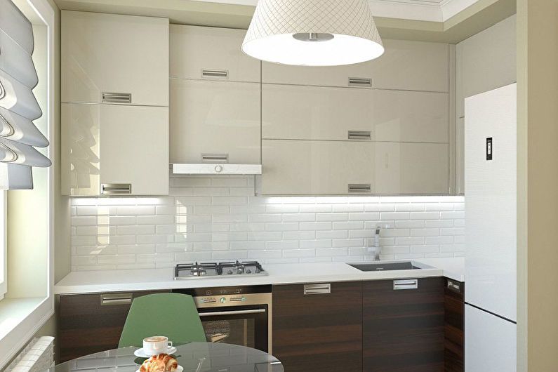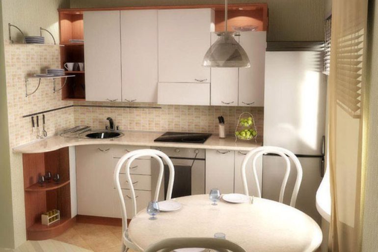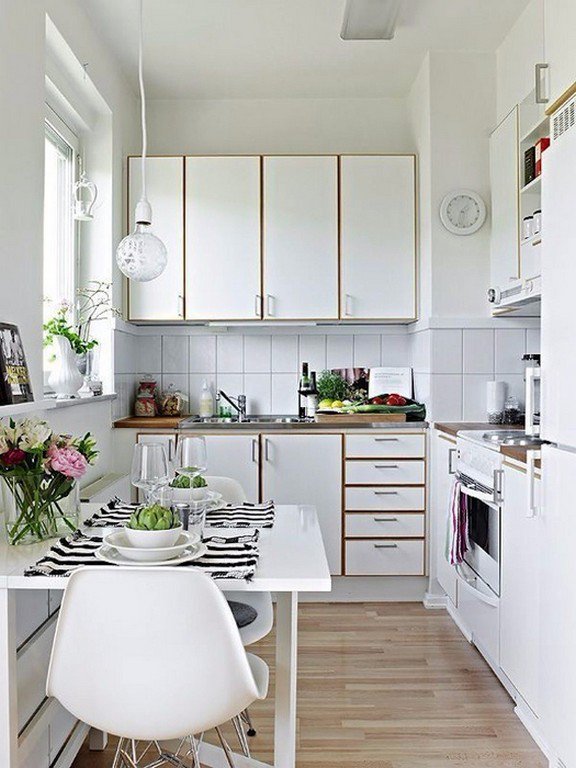 Pour une cuisine de petite surface, un intérieur clair aux couleurs claires avec un minimum de décoration et un mobilier pratique est le mieux adapté.