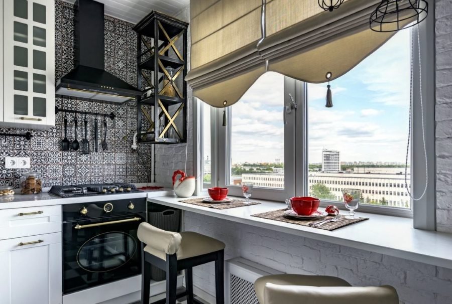 - Il est préférable de combiner le rebord de la fenêtre avec la table de la cuisine. Cela donnera une zone de travail supplémentaire et déchargera la pièce des joints inutiles.