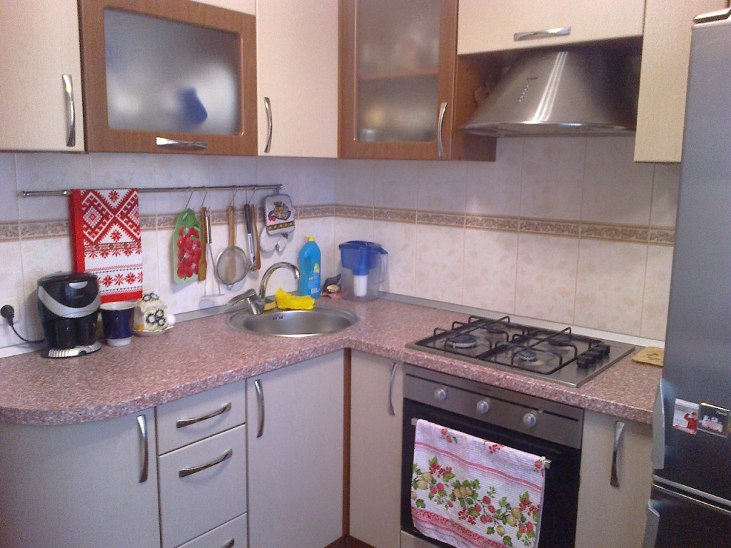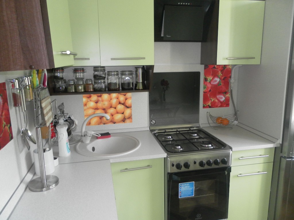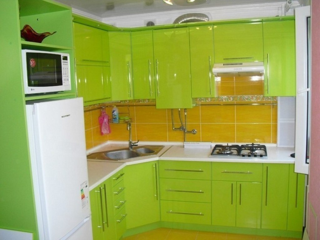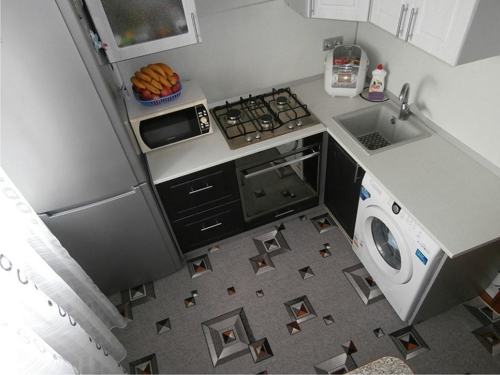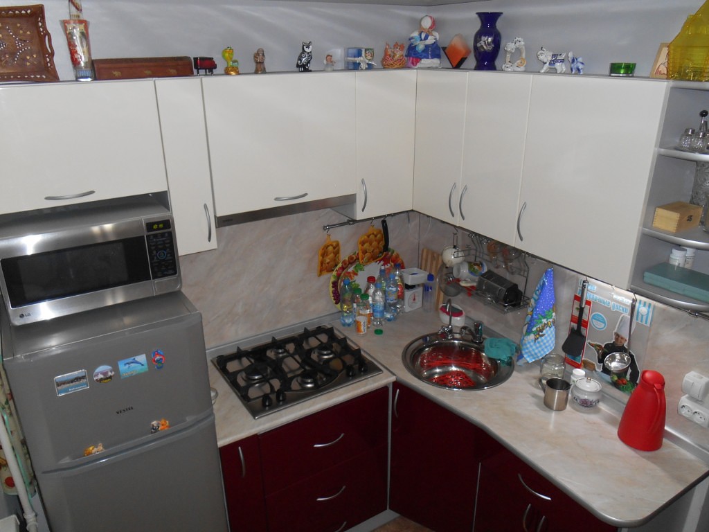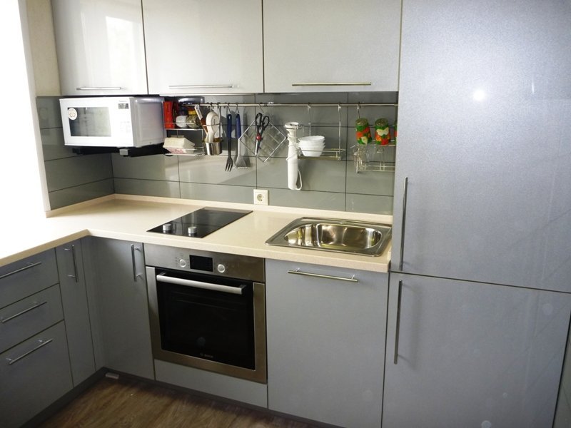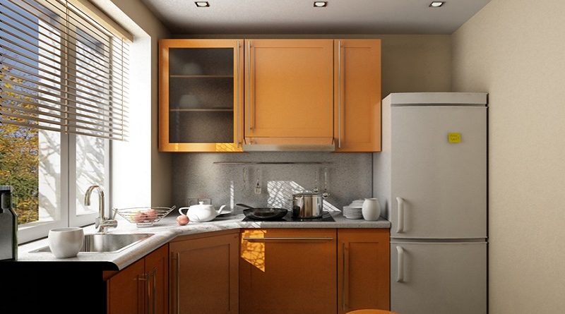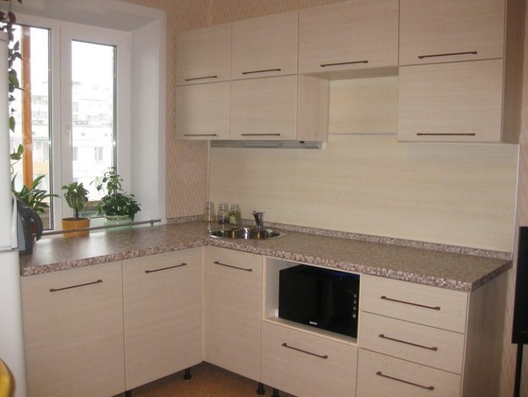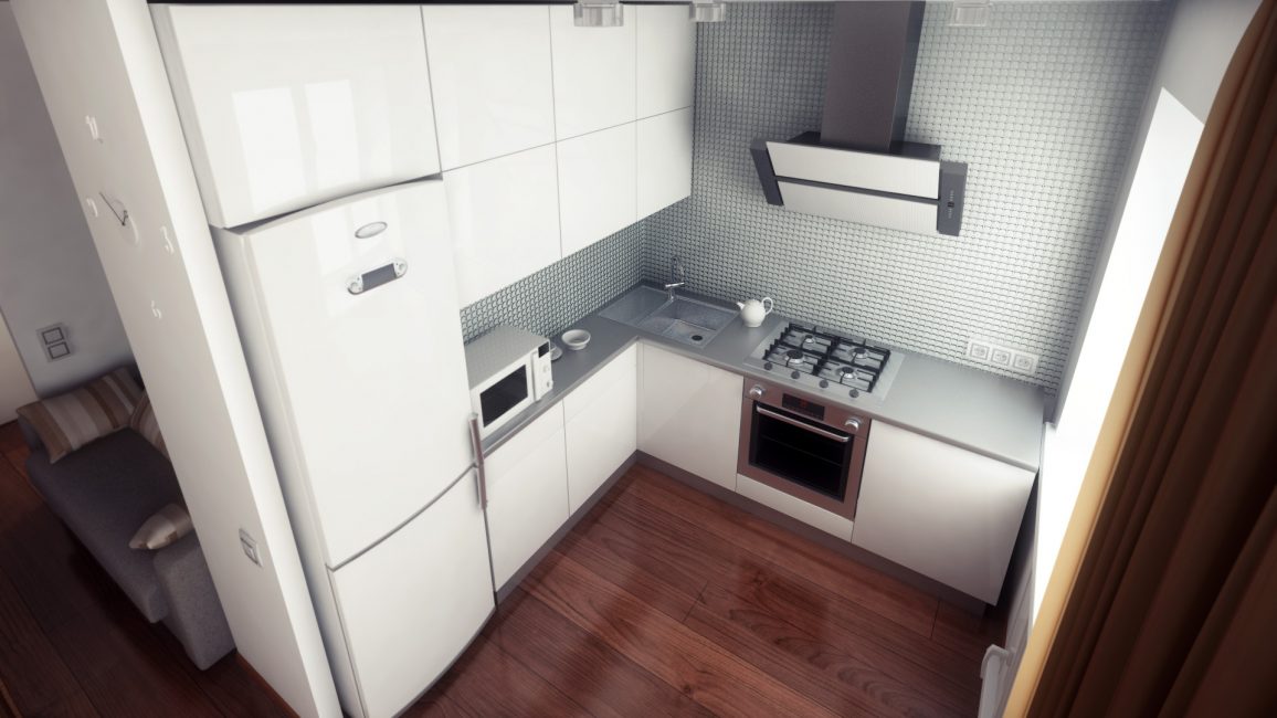 - La cuisine est préférable de mettre dans le coin de la pièce. Dans le coin, il y a un évier ou une zone pour les petits appareils électroménagers, par exemple un micro-ondes, un robot culinaire, etc.