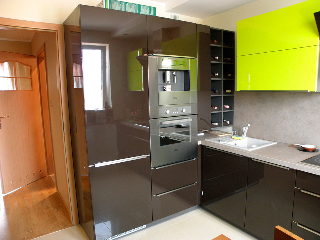 Le réfrigérateur de ces cuisines mange environ 0,4 mètre carré, et c'est le point de départ de toute cuisine de projet de conception. De son emplacement, la logique du placement de l'ensemble de cuisine et de la salle à manger est construite.