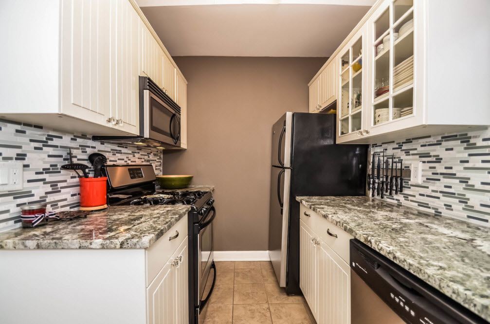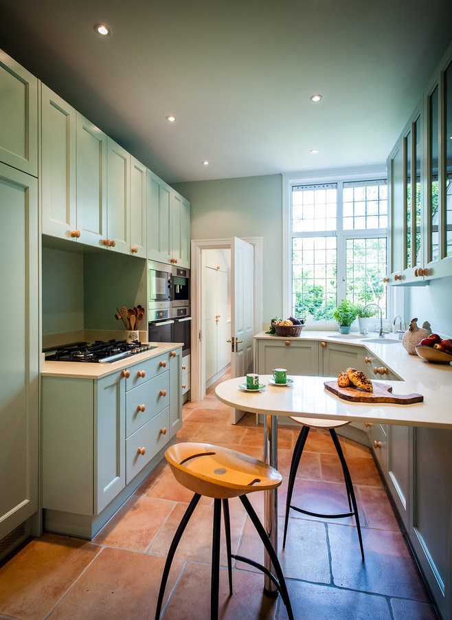 - Rangée simple (avec des meubles le long d'un mur, mieux adaptée aux cuisines classiques carrées).