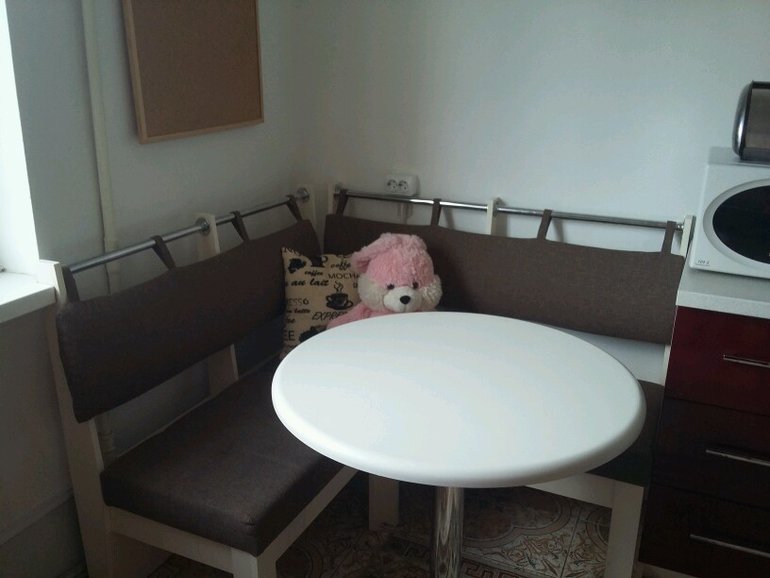 Pour maximiser l'utilisation de tout l'espace disponible, il vaut la peine de considérer les ensembles de cuisine intégrés en coin. Si vous voulez mettre un canapé ici, il est préférable de choisir une ligne droite - elle occupera des endroits plus petits que le coin, et en termes de fonctionnalité, ils sont presque identiques. Une petite table rectangulaire le complètera. Si vous voulez une table ronde, alors vous devez oublier le canapé - seules les chaises qui économiseront un peu d'espace y iront.