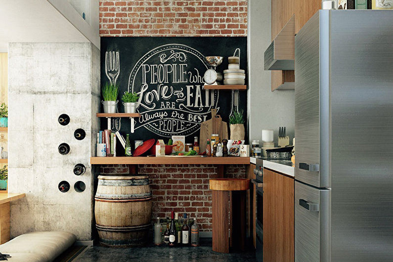 Un studio de cuisine est une autre option pour agrandir la zone. Le plus souvent, les murs qui ne remplissent pas la fonction du roulement sont démolis, et le résultat est une cuisine combinée avec un salon. Les zones se distinguent généralement par un comptoir de bar - il est installé à la place d'un mur démoli ou dans tout autre endroit pratique. Une hotte joue ici un rôle important - il est conseillé de choisir le modèle le plus puissant qui éliminera toutes les odeurs lors de la cuisson.