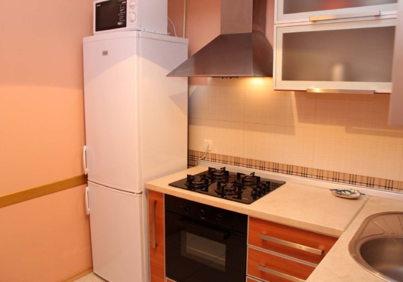 L'évier est généralement équipé dans le coin de la cuisine. S'il reste de la place, ils placent un réfrigérateur sur le bord, de préférence pour l'ouvrir, la porte vous permet de vous déplacer librement dans la cuisine.