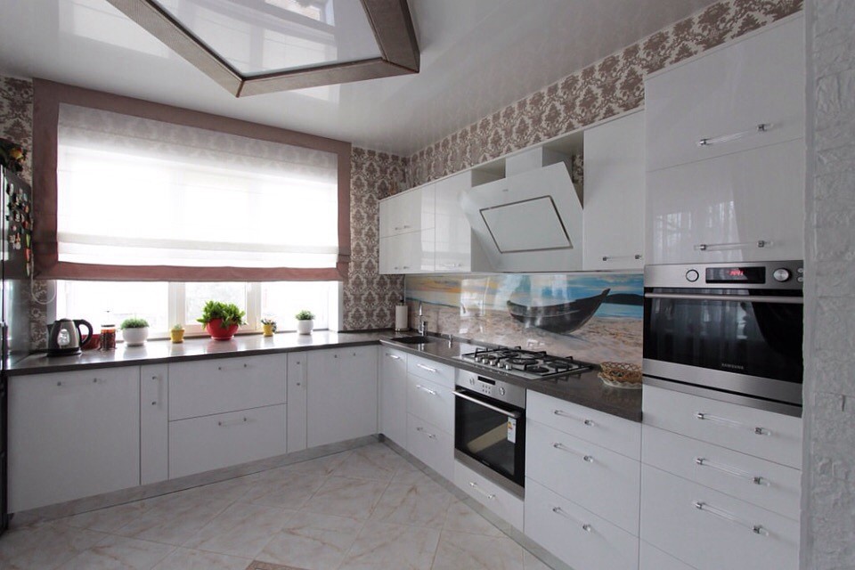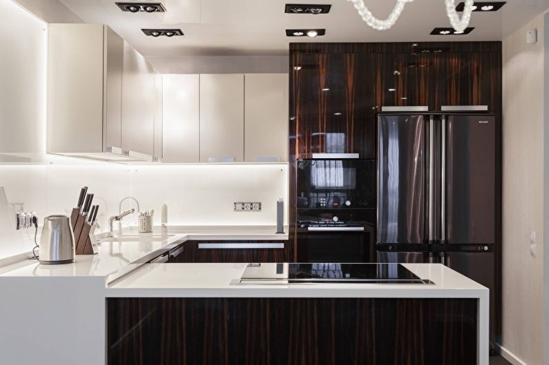 L'ensemble de cuisine est simplement obligé de briller avec éclat, une façade brillante presque miroir avec des poignées en métal ou sans elles devrait occuper un minimum d'espace, mais être fonctionnelle et belle. Des lignes lisses et claires, la forme géométrique correcte sans éléments décoratifs et autres finitions, c'est ce à quoi vous devez faire attention. En regardant un tel ensemble de cuisine, il peut sembler qu'il s'agit d'une seule unité, d'une ligne continue, sans dépressions ni transitions.