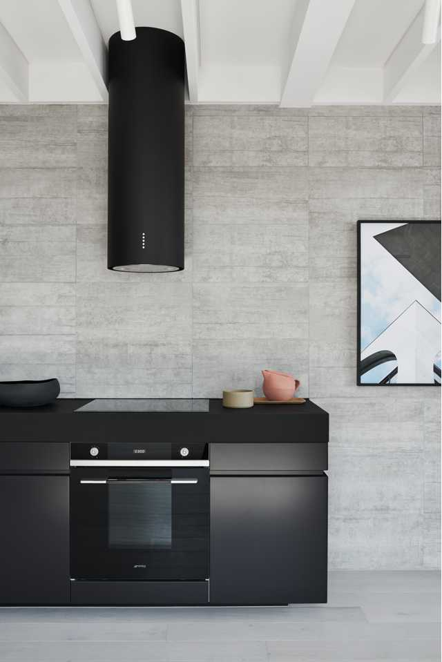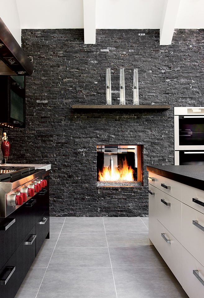 Les teintes foncées conviennent à une grande cuisine avec vitrage panoramique.