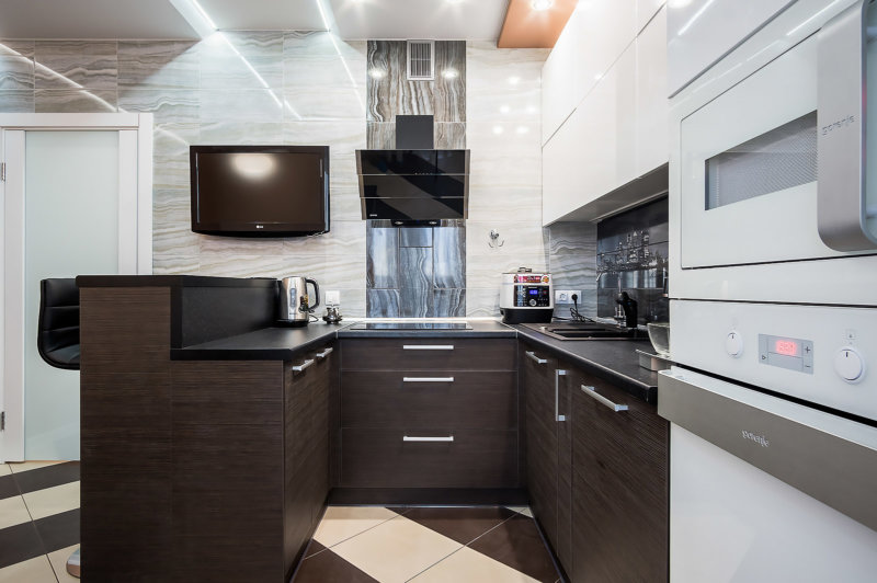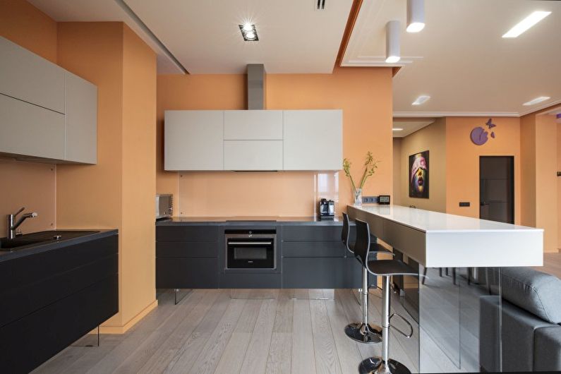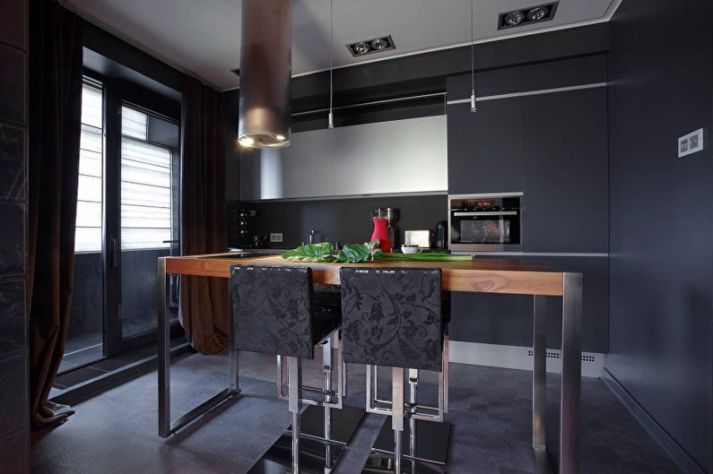 Pas de hotte ni de four encastré, chaque pièce d'équipement doit avoir sa propre place, une sorte de piédestal. Cela s'applique également aux petits appareils de cuisine tels que les mélangeurs, les cafetières et autres appareils, ils peuvent être placés en toute sécurité sur le comptoir de l'unité de cuisine. L'abondance d'équipement technique de la cuisine, correctement placée dessus, indiquera à la personne qui est venue à la maison la meilleure façon possible de décorer l'intérieur.