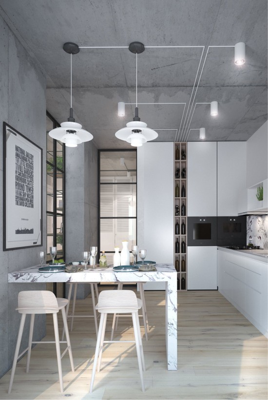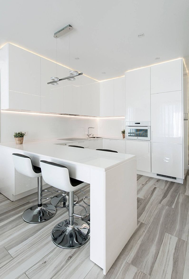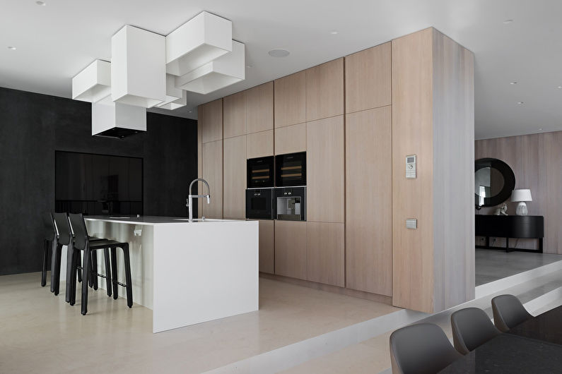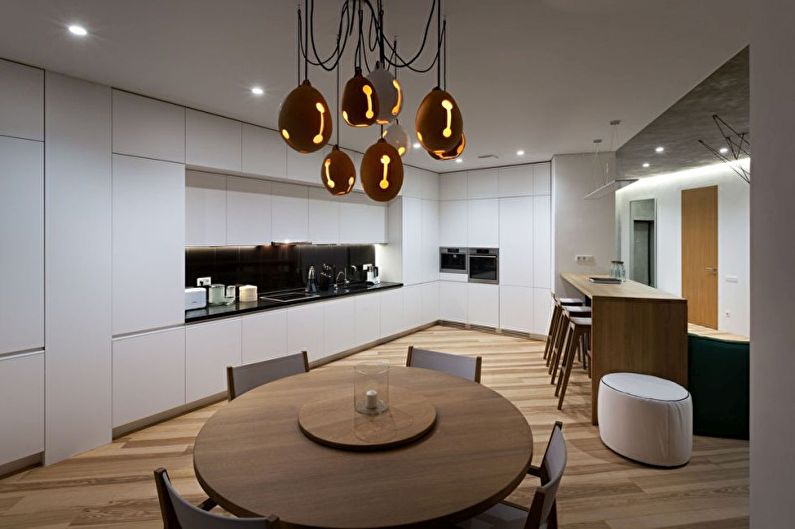 Étant donné que la prédominance des tons froids confère à la pièce une certaine froideur et gravité, vous pouvez battre cette nuance à l'aide de l'éclairage.Un éclairage correctement organisé peut changer fondamentalement la perception de l'intérieur. Pour ce style, il est d'usage d'utiliser un maximum d'éclairage artificiel, et à différents niveaux. L'éclairage du plafond, du tablier de cuisine, du sol, ainsi que l'éclairage central et mural, remplissent la pièce de lumière, ravivent sa perception.