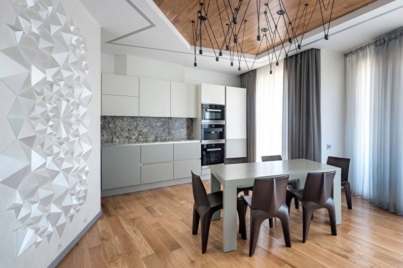 Les rideaux comme élément de décoration utilisent des volets roulants, japonais, romains ou stores (à la fois en métal et en plastique). Les plats jouent également un rôle important, ils doivent s'intégrer harmonieusement dans le style général, être modernes, originaux (les assiettes carrées ou rectangulaires sont les meilleures auxquelles vous pouvez penser).
