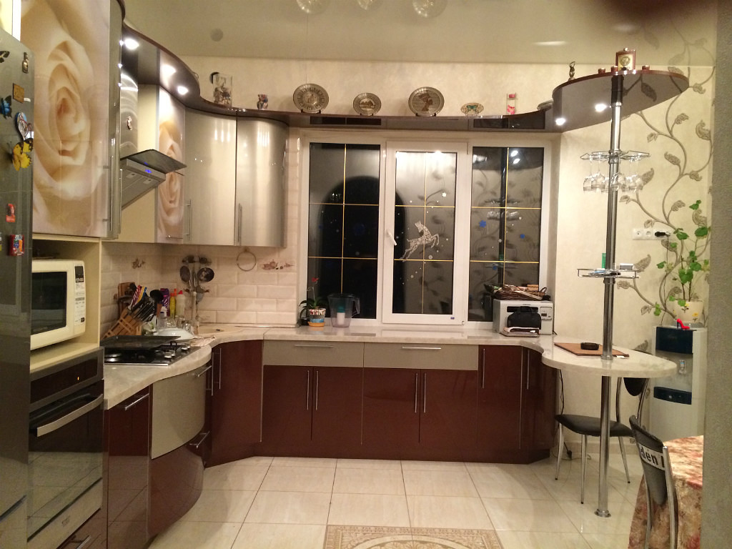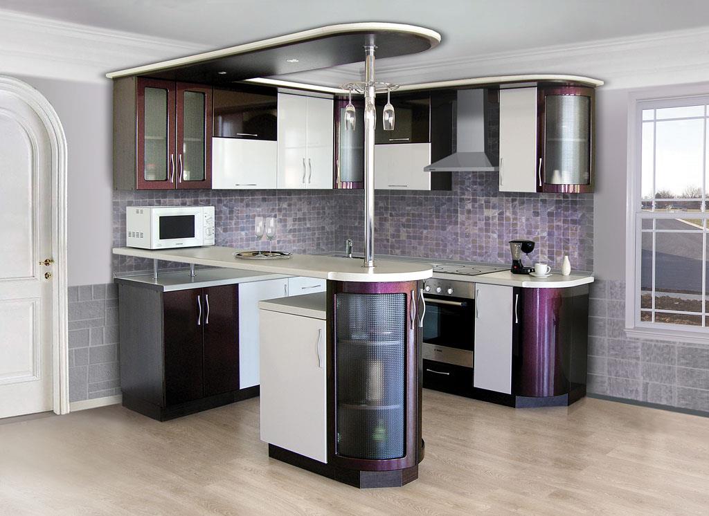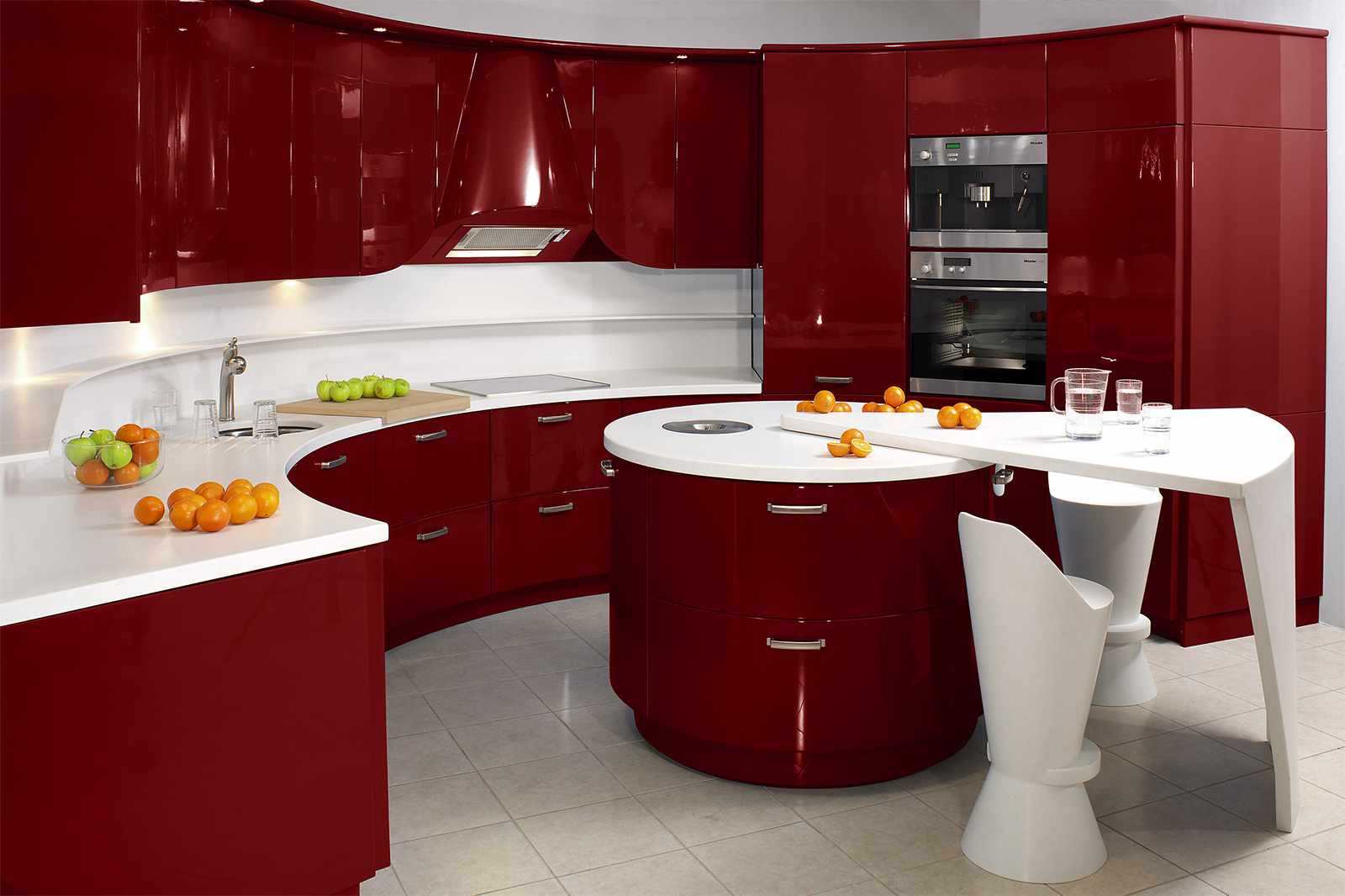 Il existe des options avec un comptoir semi-circulaire. Dans ce cas, une table à manger complète est obtenue, à laquelle un grand nombre de membres de la famille peuvent s'asseoir. Ce type convient également davantage aux pièces spacieuses.