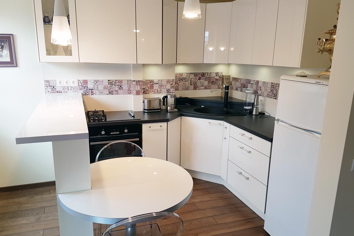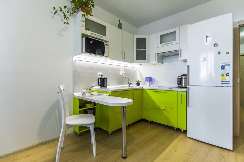 Même une très petite cuisine d'angle avec une barre de petit-déjeuner est beaucoup plus fonctionnelle que toute autre option, car elle vous permet de vous passer d'une table à manger.