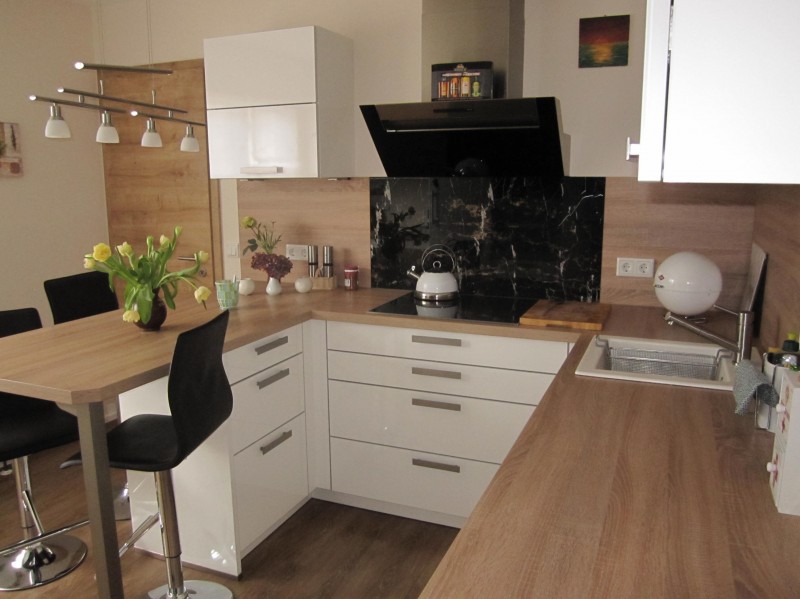 L'évier est mieux placé juste dans le coin de la pièce où passe le casque d'angle, car c'est là que se trouvent les colonnes montantes. Une machine à laver peut être placée près de l'évier. Son placement est possible sous la barre. Mais cette option ne sera pratique que pour les pièces spacieuses. Dans une petite cuisine, il est préférable de laisser l'espace sous le bar sans accessoires pour pouvoir y faire des chaises. Ensuite, ils n'interféreront pas dans la cuisine.