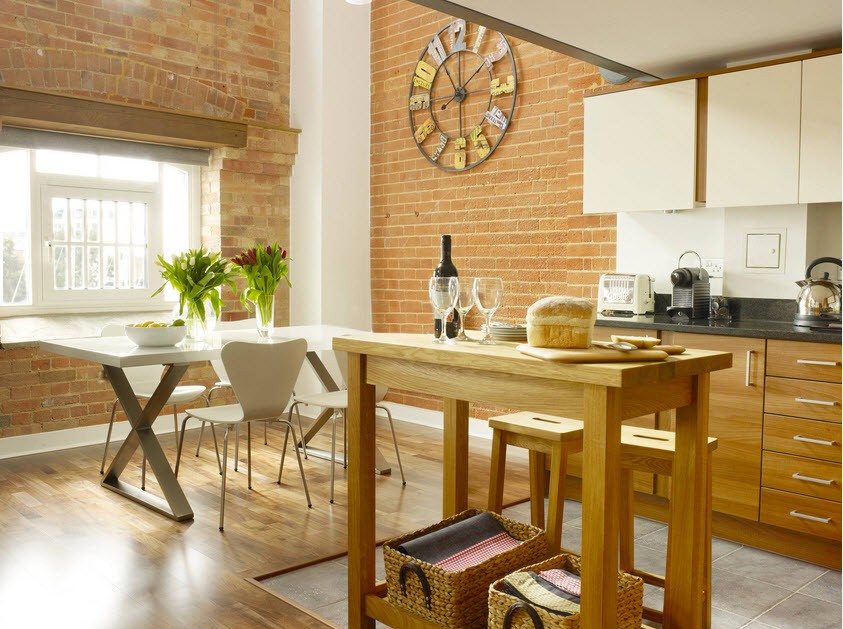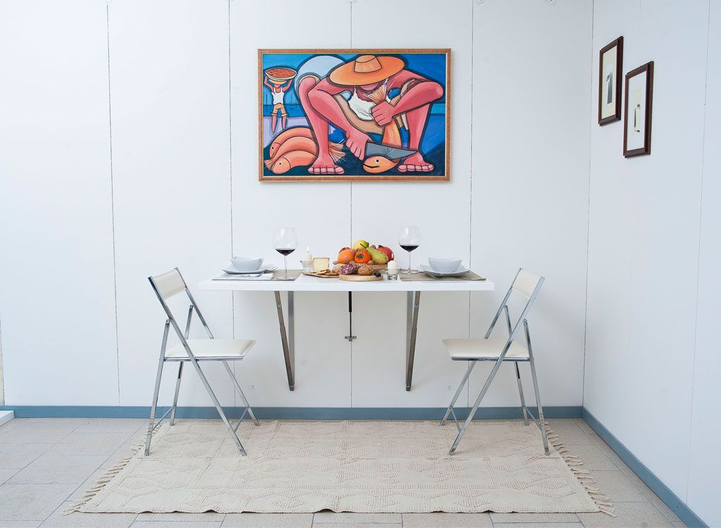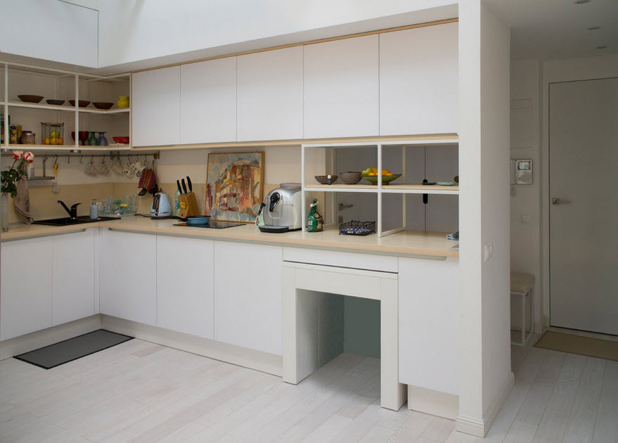 La table pliante pour la cuisine contre le mur est une conception assez simple et pratique. En position repliée, il occupe un minimum d'espace et 2-3 personnes peuvent se déplacer librement dans la pièce.