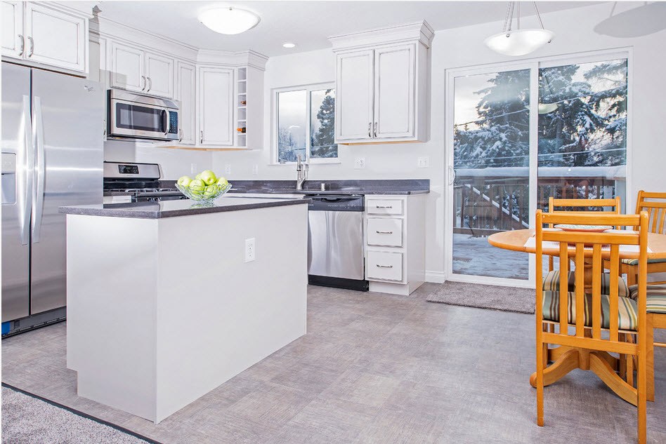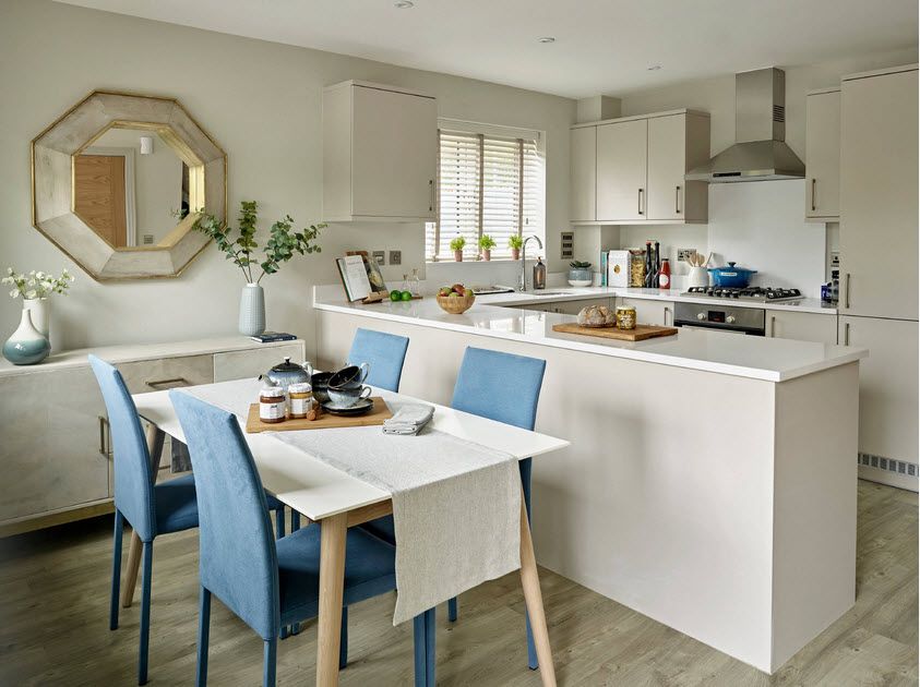 Une table à manger séparée du coin cuisine est l'option la plus courante. Il s'intègre bien dans l'espace de la pièce. Son emplacement séparé de l'ensemble de cuisine favorise la communication et l'envie de passer du temps libre dans la cuisine.