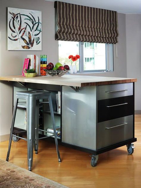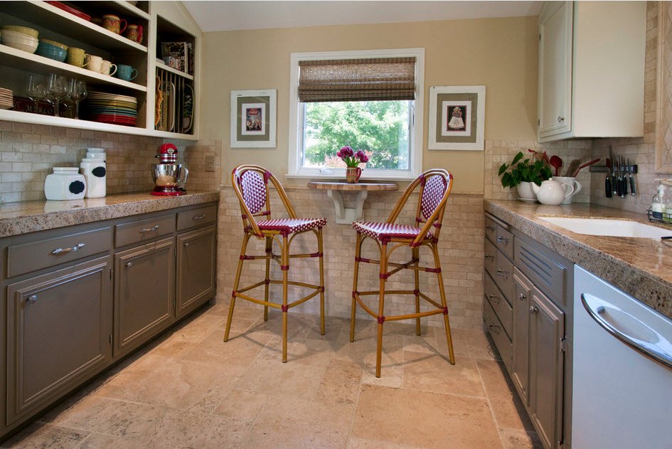 Il y a une grande quantité de meubles adaptés à une petite pièce.Parmi les options pertinentes, on peut noter: standard - assemblé à partir de comptoirs et de pieds; non standard - attaché à la surface et aux pieds non fournis; articulé - fixé au mur, mais des pieds peuvent être disponibles; comptoir de bar - allongé, qui peut être disposé le long d'une surface verticale.