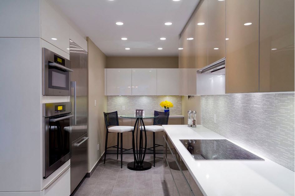 Pour une petite cuisine, il est nécessaire de choisir des meubles bon marché de couleur claire, de préférence avec une surface brillante, ce qui rendra visuellement la pièce plus spacieuse. N'oubliez pas les chaises, car elles prennent également beaucoup de place.