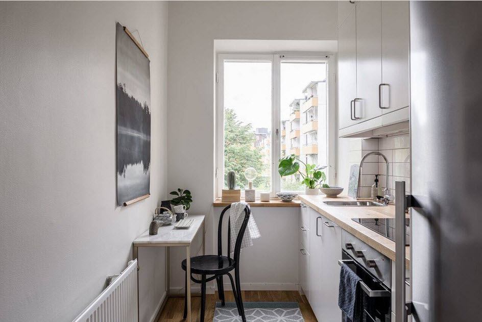 Si la cuisine a très peu d'espace, il faut alors envisager l'option étroite. Ils peuvent également comprendre un bar, qui peut être à la fois une continuation du rebord de la fenêtre et la délimitation du salon de la cuisine.
