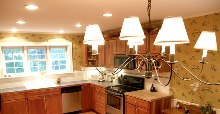 L'utilisation de lustres encombrants n'est pas fortement recommandée dans une petite cuisine. Dans une petite pièce, il aura l'air à grande échelle et peu pratique.