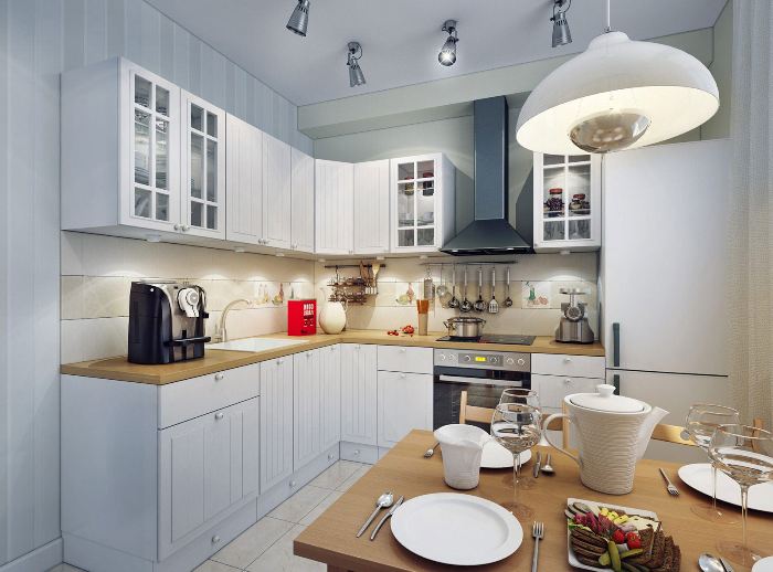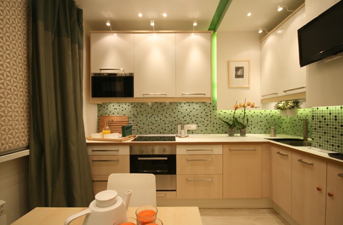 Si les images de la cuisine sont très petites - il est recommandé d'installer de la lumière autour du périmètre ou en face l'une de l'autre.