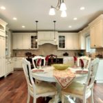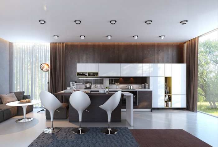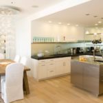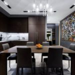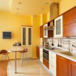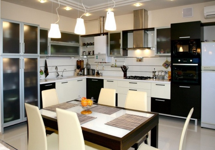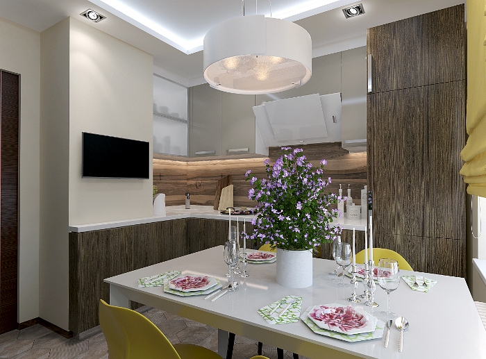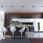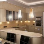 - L'agencement des luminaires - la première chose qui est nécessaire est de diviser le plafond en zones. Classiquement, la cuisine est divisée en un endroit pour cuisiner et un endroit où cette nourriture est consommée. Pour mettre en valeur la surface de travail, des points lumineux sont installés le long des armoires de cuisine. La lumière pour la salle à manger peut être réalisée sous la forme d'un carré ou d'un ovale.