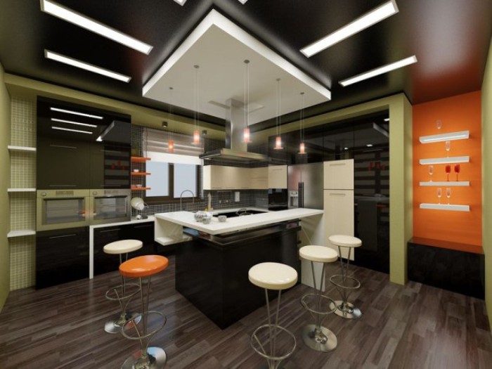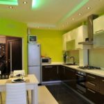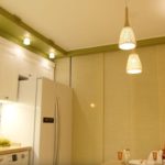 Considérez quel type d'éclairage se produit dans une cuisine avec un plafond tendu, une photo avec des options pour les schémas de distribution.