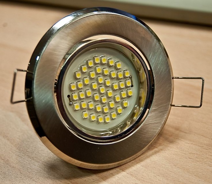 Les sources ponctuelles d'éclairage modernes peuvent être un élément indépendant ou compléter le lustre. Un luminaire installé peut éclairer environ 2 mètres carrés. mètre.