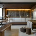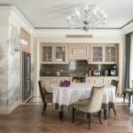 | Moderne | C'est l'un des styles les plus complexes et les plus chers. Pour équiper la cuisine dans un style moderne, ils obtiennent des meubles vintage chers, en décoration ils utilisent du bois naturel, de la pierre, des moulures en stuc, du marbre. Une attention particulière est portée à la conception du plafond. Il est souvent fait à plusieurs niveaux, décoré de motifs végétaux, au milieu complété par un beau lustre. |