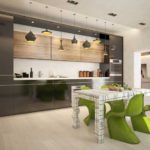 Lors de la conception d'une grande cuisine, il n'y a pratiquement aucune restriction sur les couleurs. Vous pouvez appliquer le vert acide, le rouge, le noir, le violet, toutes autres couleurs vives. Mais il est important de suivre deux règles simples. La première règle est que vous ne pouvez pas utiliser plus de trois couleurs différentes dans une même pièce. Le mélange incroyable au fil du temps ne sera que gênant. La deuxième règle est l'adéquation. Si une teinte brillante est sélectionnée, elle doit être utilisée en quantité limitée. Par exemple, sur la façade du casque ou sur le sol.