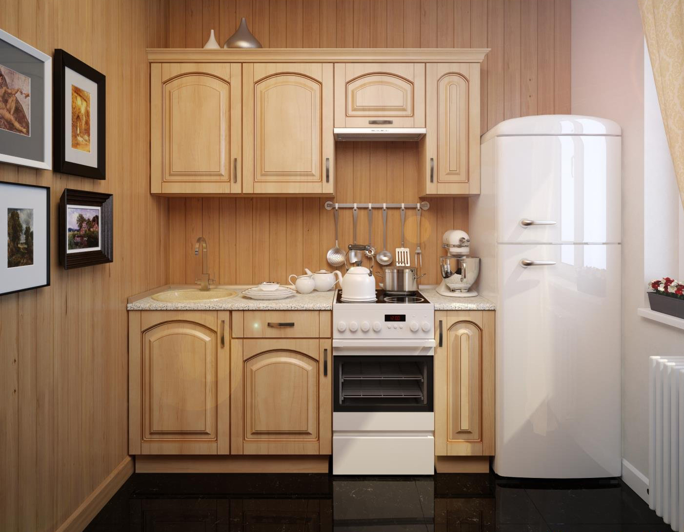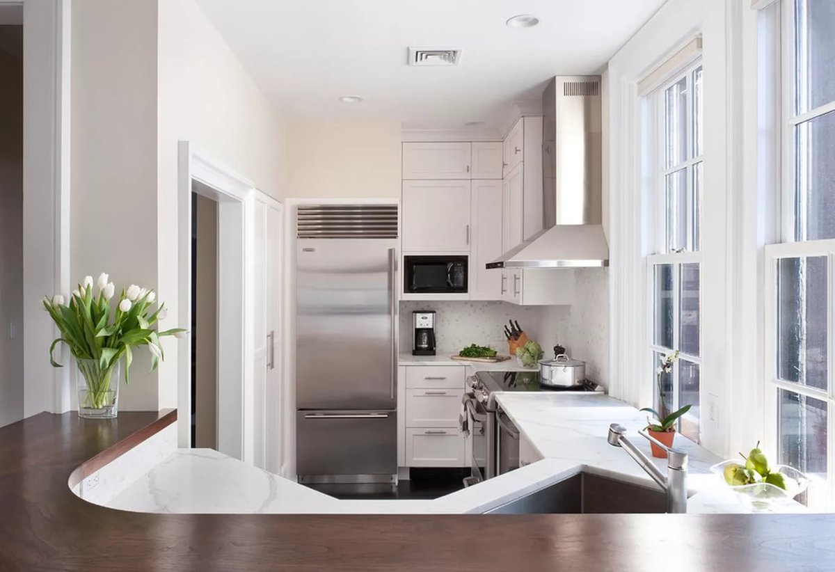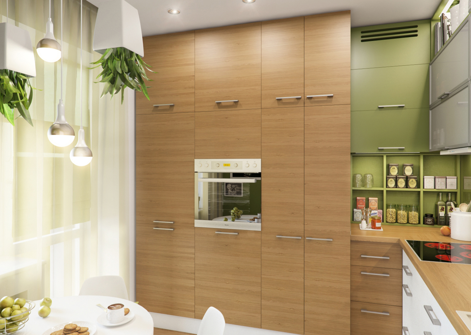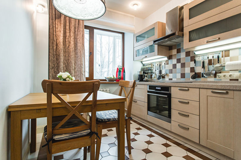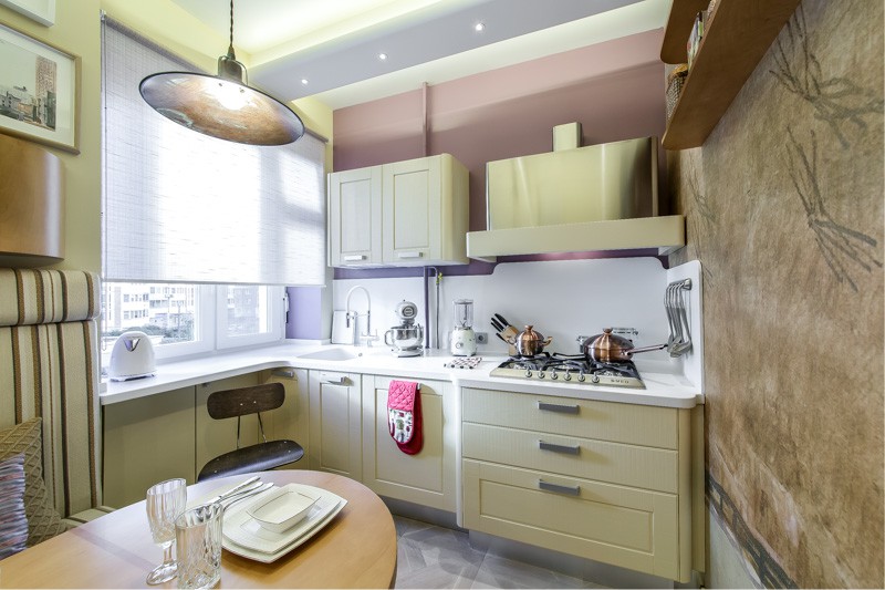 Pour une cuisine de moins de 9 mètres carrés, vous pouvez choisir un ensemble de cuisine de taille non standard, par exemple, avec une table de découpe rétrécie, des armoires hautes et des surfaces de travail coulissantes. L'ensemble, de la même couleur que les murs, sera visuellement plus petit. Pour économiser de l'espace, selon la forme de la pièce, vous pouvez choisir un casque d'angle, afin de ne pas occuper un mur entier.