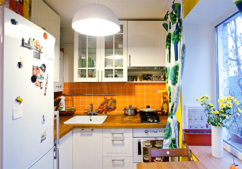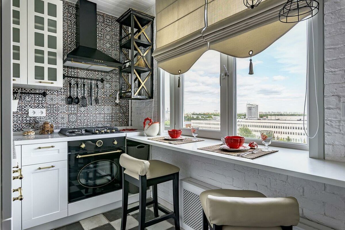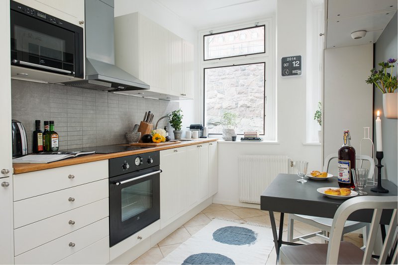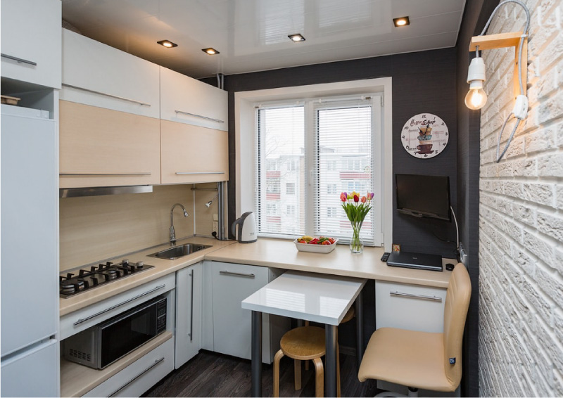 Pour augmenter les mètres carrés utiles, vous pouvez utiliser un mur avec une fenêtre, l'espace sous le rebord de la fenêtre - y équiper une armoire pour les ustensiles de cuisine. Le rebord de la fenêtre lui-même est facilement converti en une surface pratique pour la cuisson.